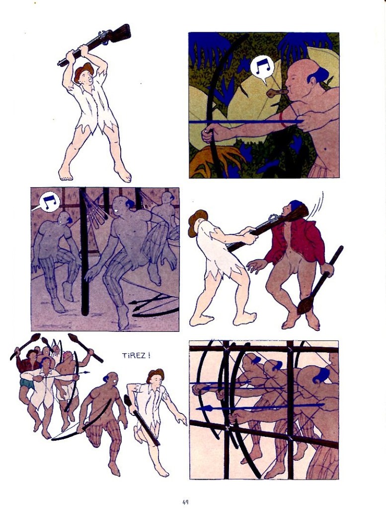 Les auteurs ne pouvaient occulter le cannibalisme. Il y a donc une scène représentant l’avant et l’après s’arrêtant au moment où ils assomment le sacrifié et reprenant alors qu’ils terminent leur repas auprès du feu. Le côté gore de la scène sera toutefois évoqué dans les pages de garde sous la forme d’une déclinaison monochrome d’une gravure de 1592 de Théodore de Bry dessinateur, graveur et éditeur protestant qui bien que n’ayant pas voyagé lui-même est connu aujourd’hui pour ses nombreuses illustrations sur la découverte de l’Amérique.