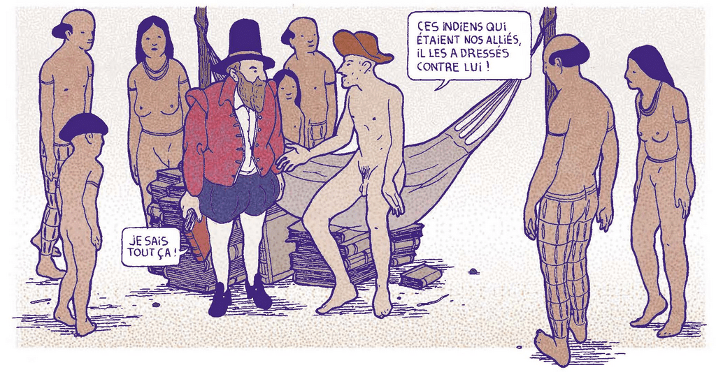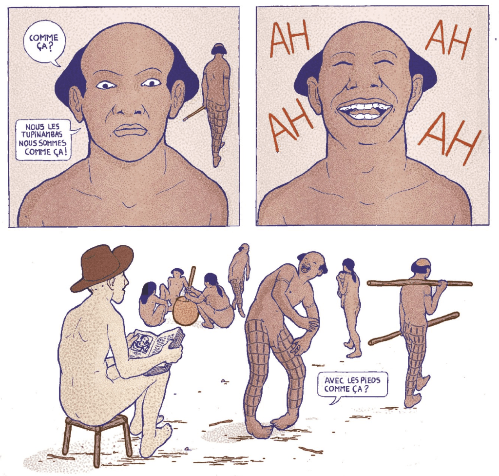 À partir d’un épisode bien réel de notre histoire, les auteurs vont faire un pas de côté et nous livrer un récit décalé plein de rebondissements en mêlant judicieusement Histoire et fiction. Contrairement aux récits de voyage écrits du point de vue des colons, eux se placent du côté des Tupinambas, dévoilant les préjugés de part et d’autre mais s’abstenant toutefois de tout jugement. La découverte du mode de vie des Tupinambas va amener chez Nicolas de nombreux questionnements philosophiques.