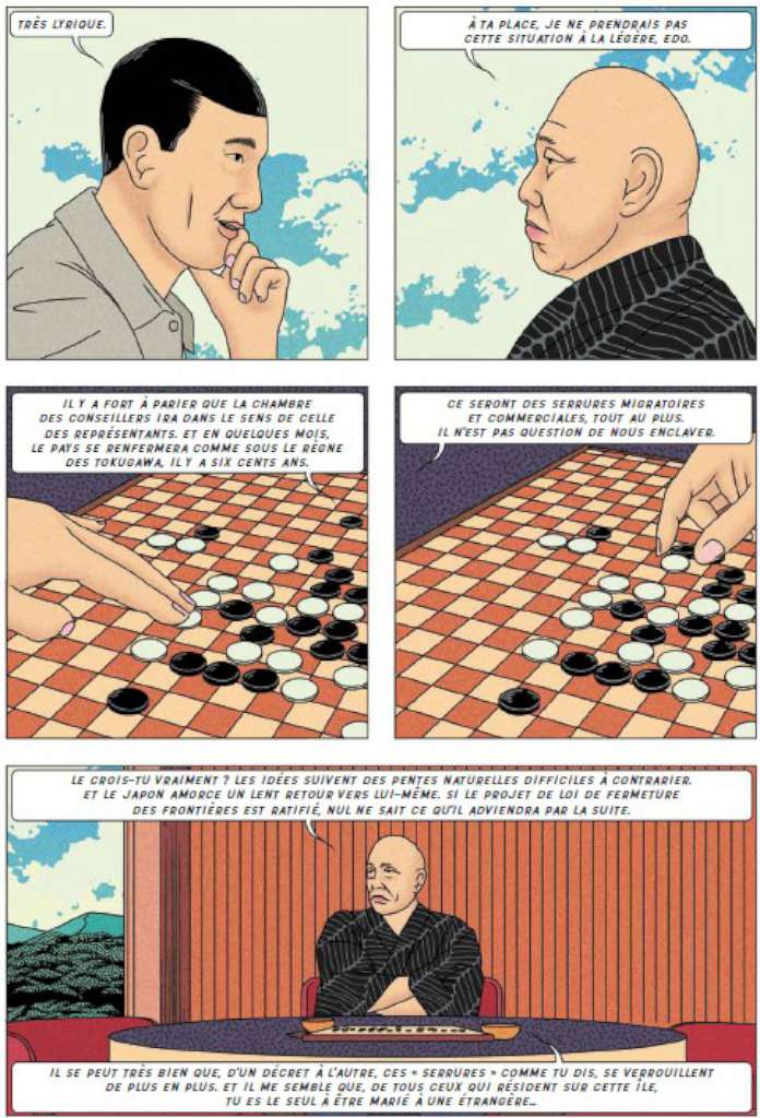 Les Japonais sont friands de parcs à thèmes avec recréation de lieux et d’époques en « carton-pâte » : on peut louer des costumes de geishas au Temple d’or de Kyoto, une ville de l’époque Heian est reconstruite dans le Esashi-Fujiwwara Heritage Park tandis que le Edowonderland à Nikko est consacré à la période Edo. Or, l’île du roman graphique s’appelle « Kino » ce qui a donné « cinéma » et elle ressemble à un décor du 7e art comme le soulignent d’ailleurs le personnage de la jeune pianiste tokyoïte et la séquence d’ouverture de l’album. Les auteurs jouent sur des visions clichées, idéalisées et presque fantasmées du Japon tout en soulignant le conservatisme et l’enfermement à la fois, spatial, politique et psychologique des protagonistes.