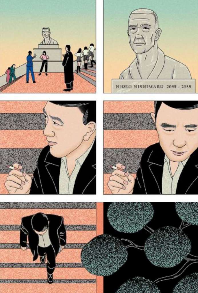 Pourtant rien à priori ne laisse présager au lecteur que l’histoire se déroule dans le futur. Il le découvre seulement à l’issue d’une longue première séquence muette de 30 pages au détour d’une case : on y voit le buste de la statue de l’ancien gouverneur de l’île et il est indiqué sur le socle « Hideo Nishimaru 2095-2155 ». Nous sommes donc dans un futur paradoxal aux allures de passé.
