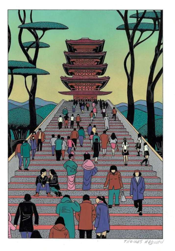 Thomas Hayman utilise des perspectives isométriques qui donnent un côté rigide et figé. Le dessin numérique apporte également une certaine froideur et distance qui sied bien au propos. On trouve enfin beaucoup de plans « zénithaux » (vues du ciel) qui permettent de se détacher d’une réalité un peu trop semblable à la nôtre en ces temps d’expansion de l’IA ainsi qu’une référence permanente à l’estampe japonaise et en particulier Hokusai (et l’on voit d’ailleurs 36 fois le Mont Fuji dans la bande dessinée comme un clin d’œil à la célèbre série d’ukiyo-e du maître).