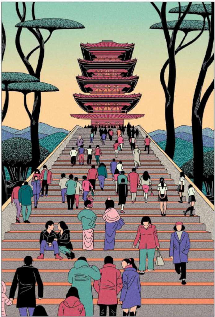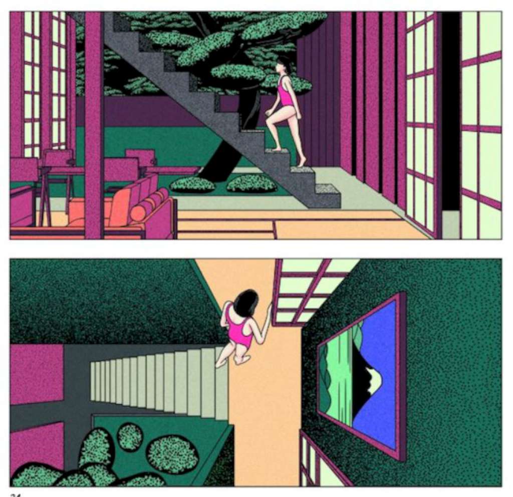 TH : Déjà, c’est du numérique, mais qui imite un peu l’estampe japonaise. Donc il y a d’emblée cette dualité entre digital et réel. Et puis oui, après, j’ai un trait ligne claire qui est très propret, très léché, très droit, très « New Yorker ». C’est un mélange un peu d’inspiration d’Orient et d’Occident, un peu Floc’h, un peu estampes japonaises avec des trames manga que j’ai aussi agrandies pour les rendre un peu plus « pop ». Donc en fait, il y a un peu toujours une dualité entre modernisme et inspirations traditionnelles japonaises.