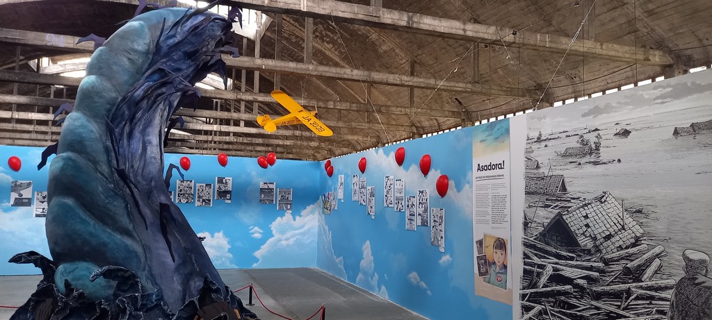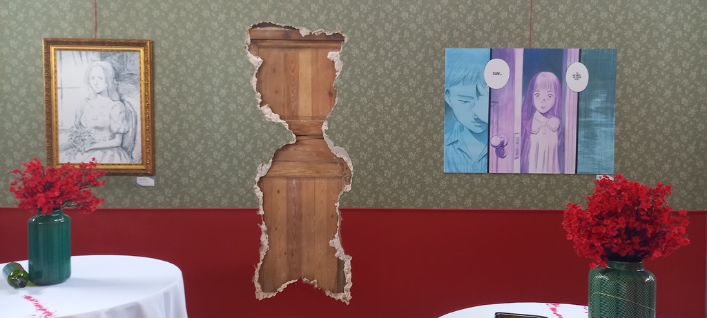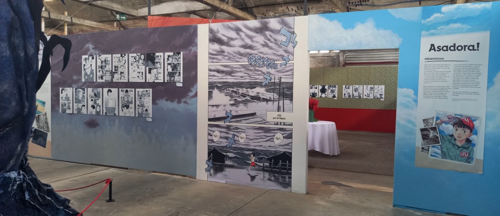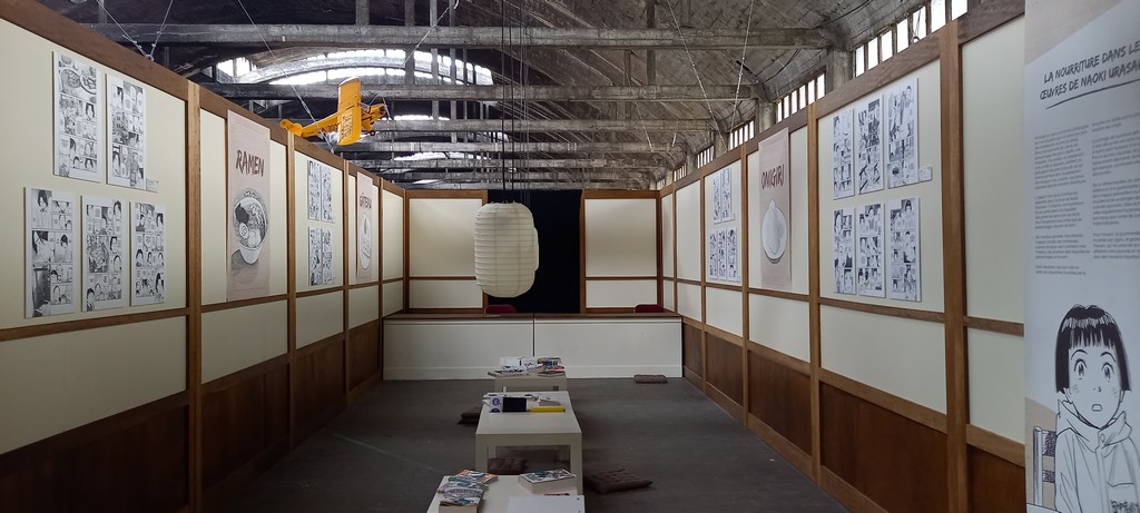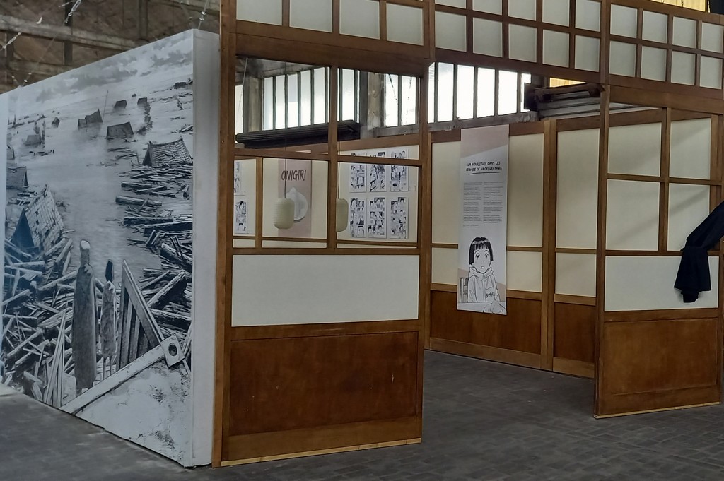 L’exposition s’achève sur la reconstitution de la « cantine de Kinuyo » – la propriétaire de ce restaurant de Nagoya a aidé Asa à confectionner des onigiris pour venir en aide aux victimes du typhon – où nous pouvons (re)découvrir les scènes du premier tome de Asadora ! dans lesquelles la nourriture occupe une place centrale. Après voir parcouru les planches ornant les murs, les festivaliers ont pu se poser et s’adonner à la lecture.