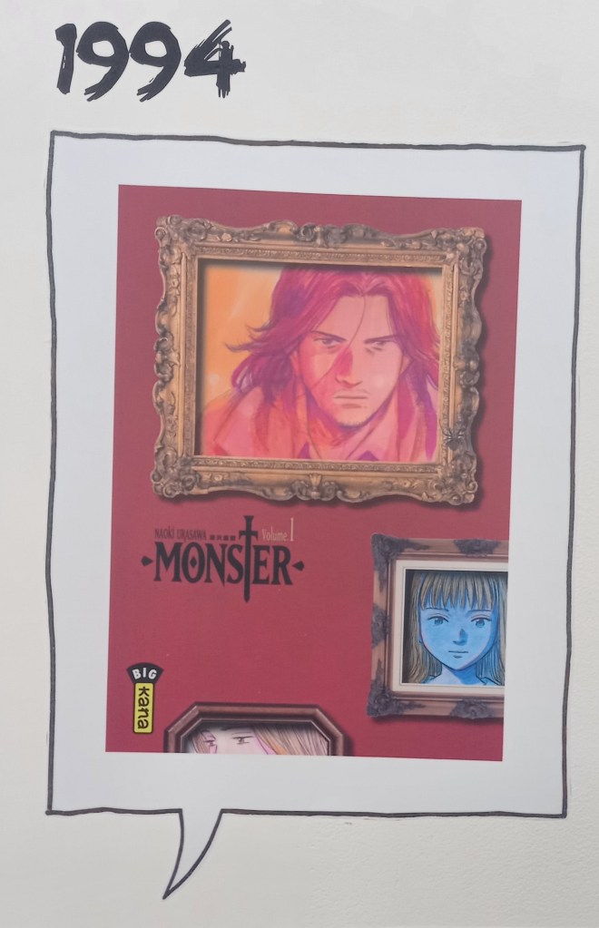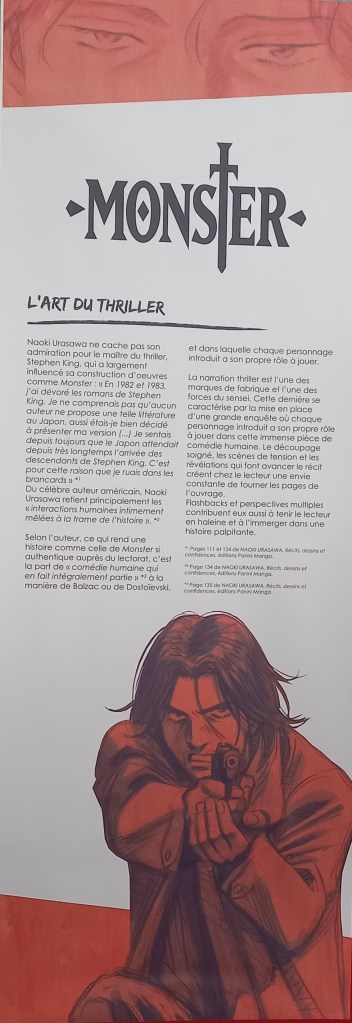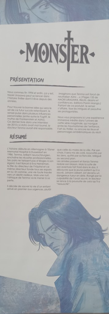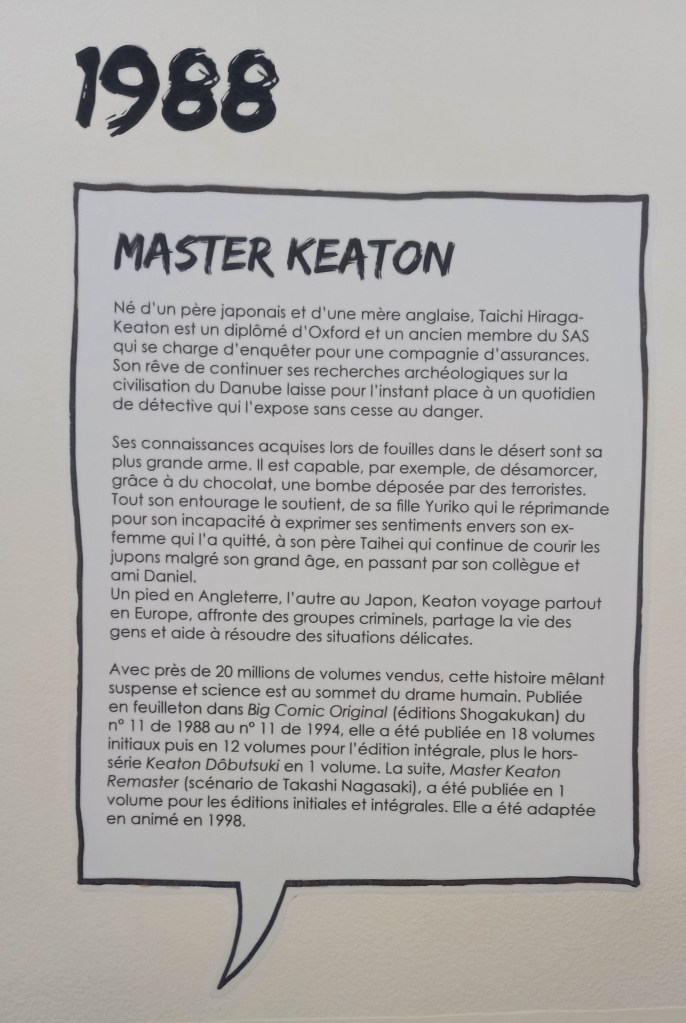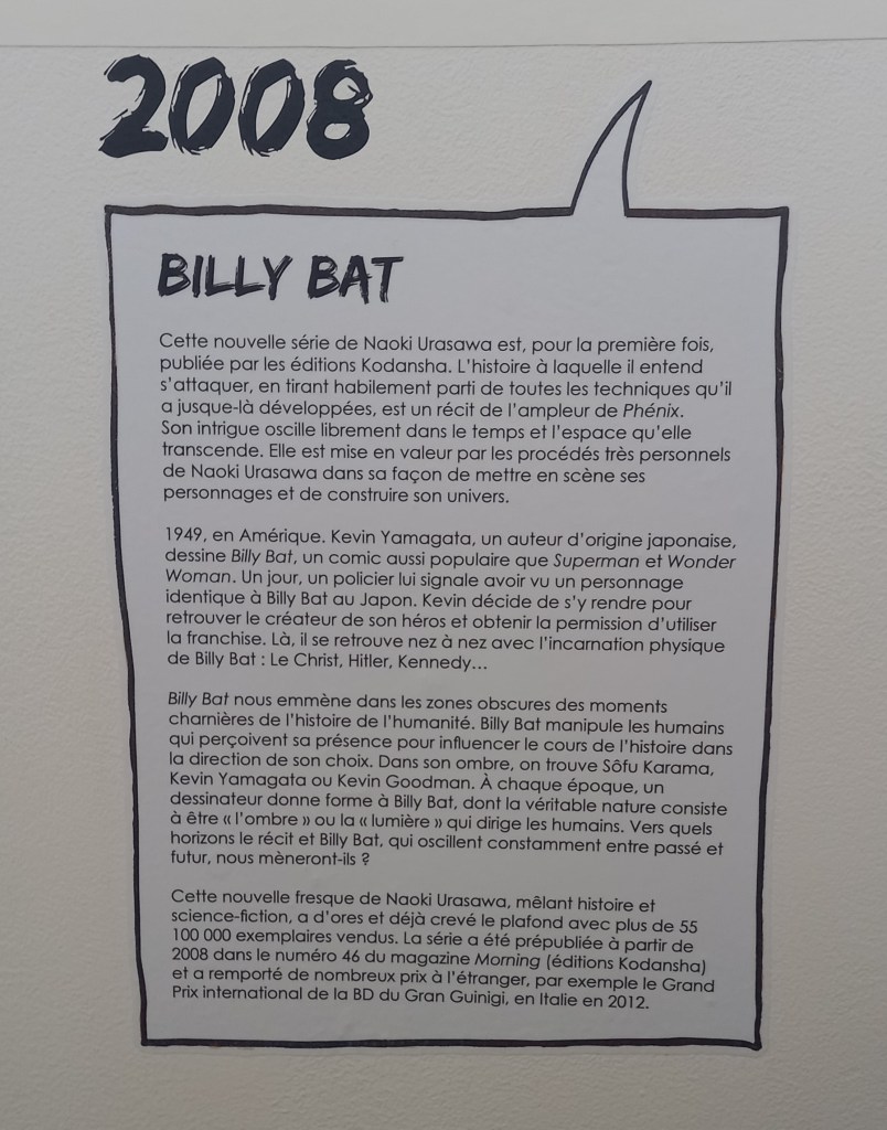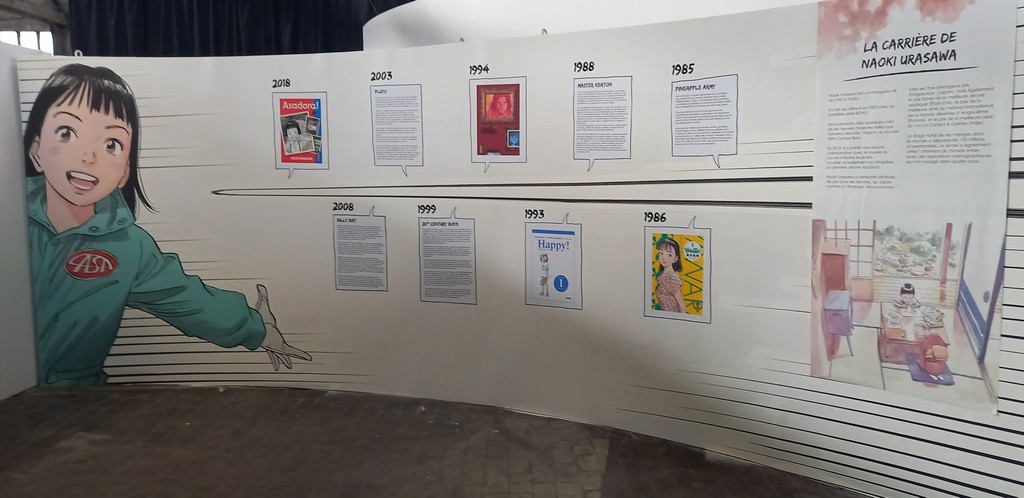 Naoki Urasawa, c’est 42 ans de carrière et plus de 150 millions d’ouvrages vendus à travers le monde. L’entrée de l’exposition est consacré à une brève rétrospective de sa carrière à travers ses faits marquants et à une présentation de ses séries à travers une frise chronologique reprenant les couvertures pour les 4 séries présentes dans l’expo et des textes de présentation pour les autres.