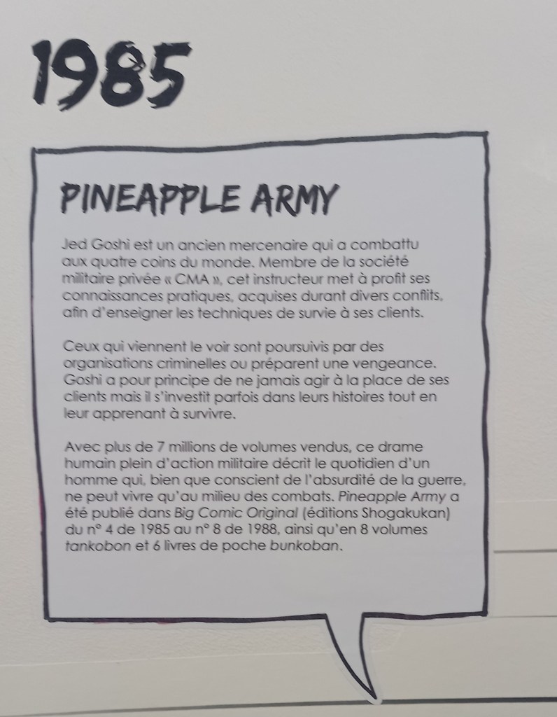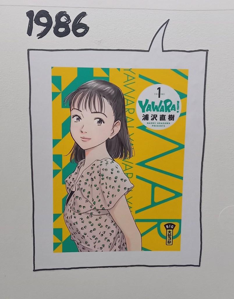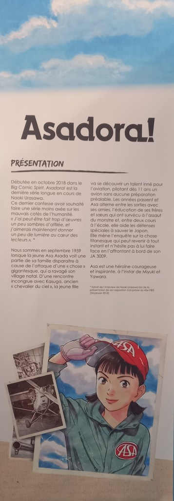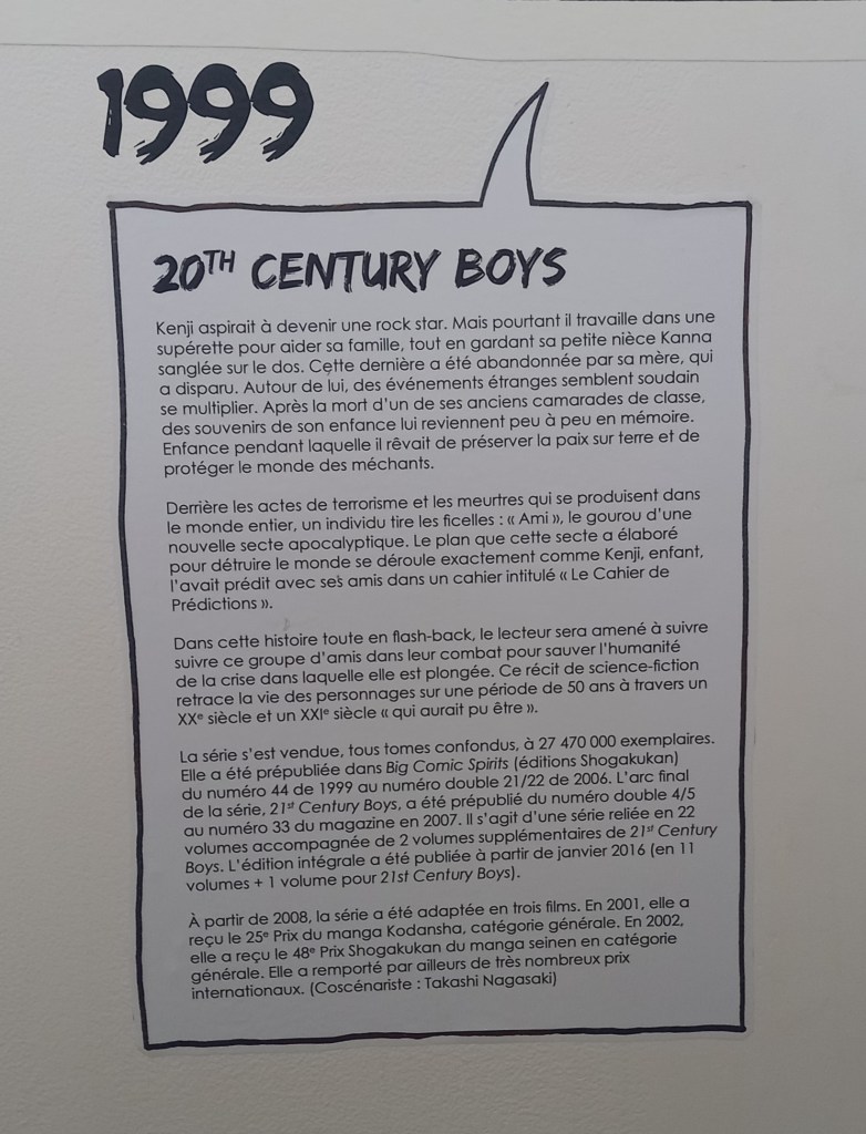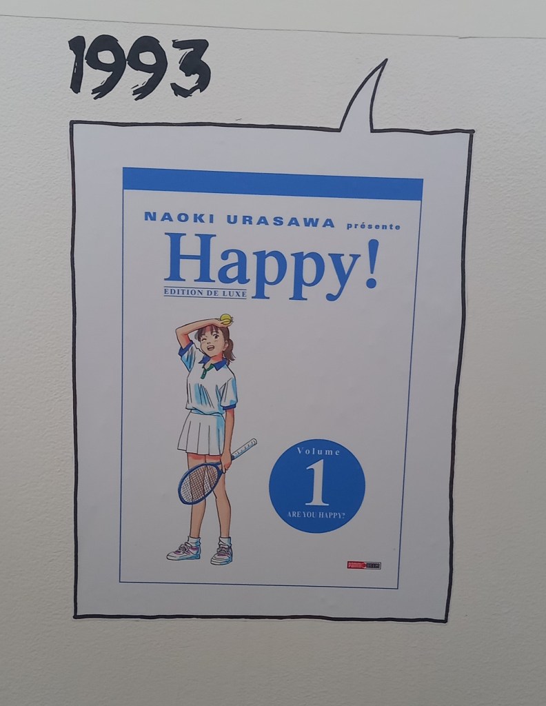 Naoki Urasawa, c’est 42 ans de carrière et plus de 150 millions d’ouvrages vendus à travers le monde. L’entrée de l’exposition est consacré à une brève rétrospective de sa carrière à travers ses faits marquants et à une présentation de ses séries à travers une frise chronologique reprenant les couvertures pour les 4 séries présentes dans l’expo et des textes de présentation pour les autres.