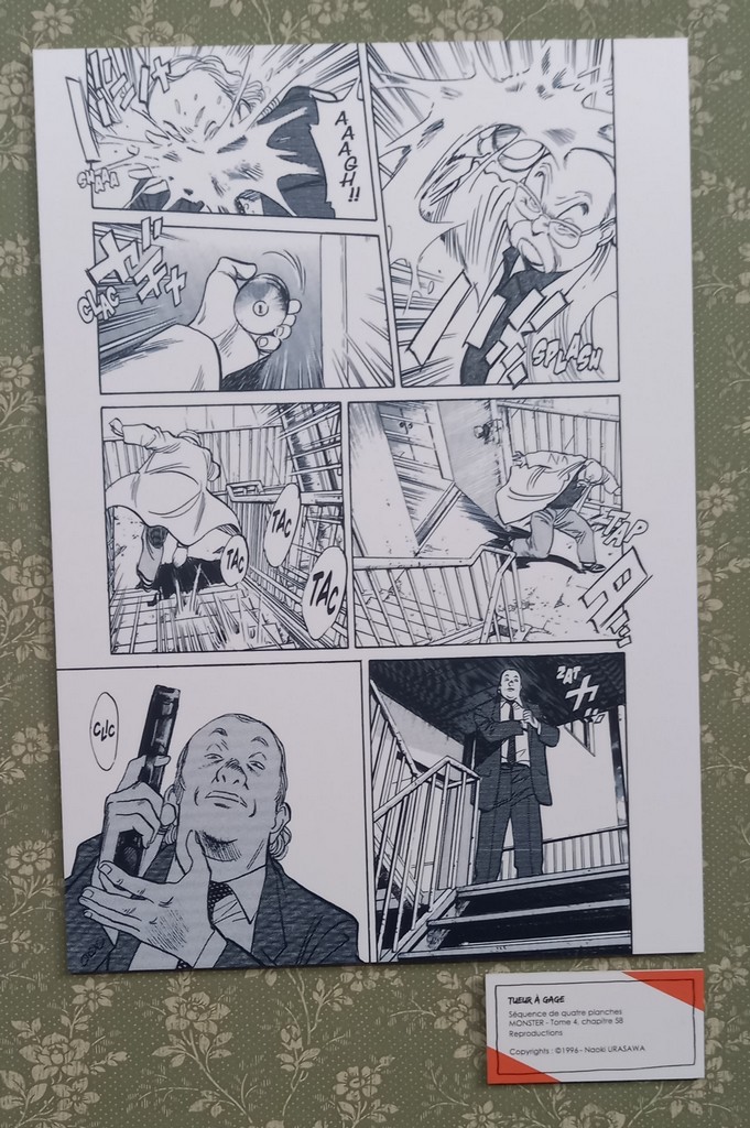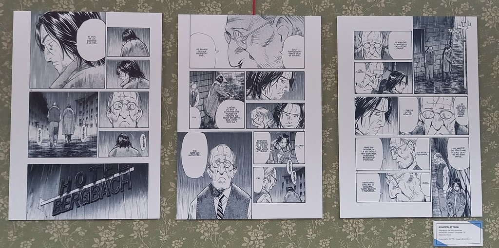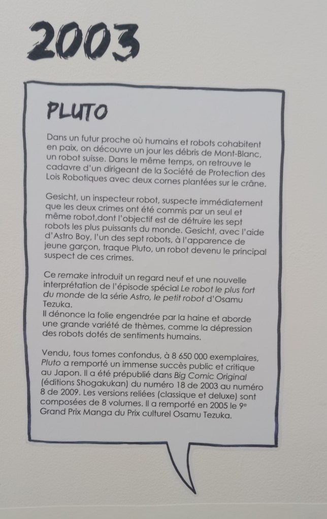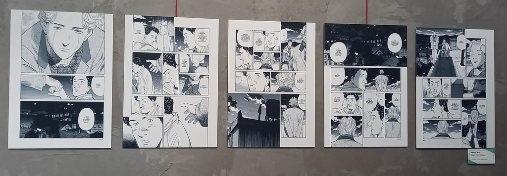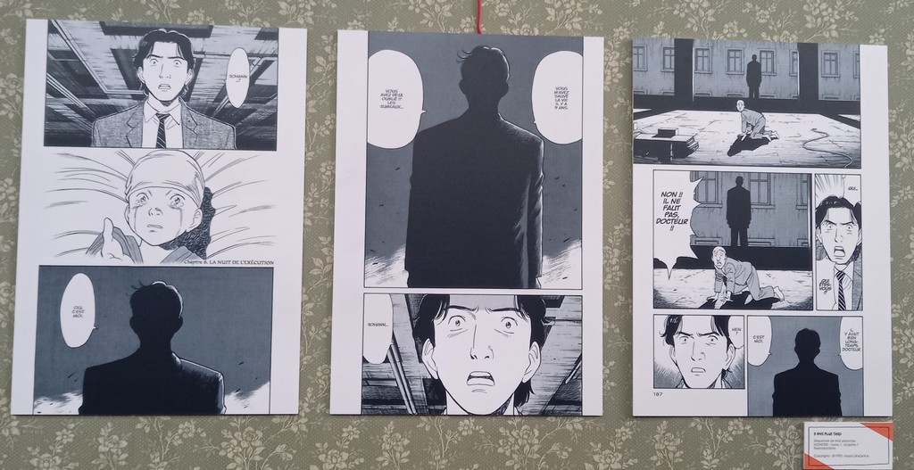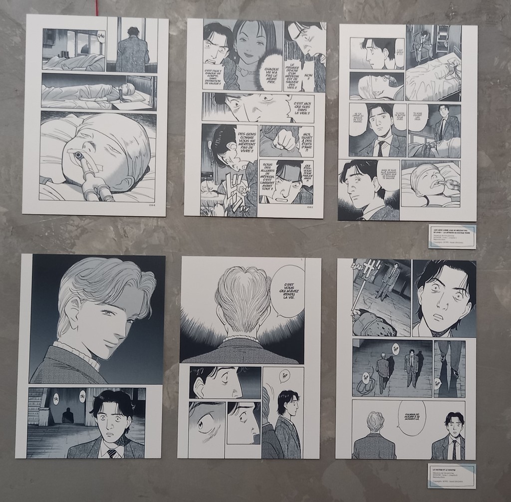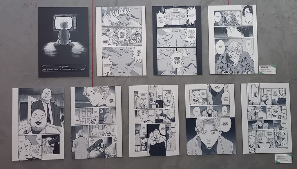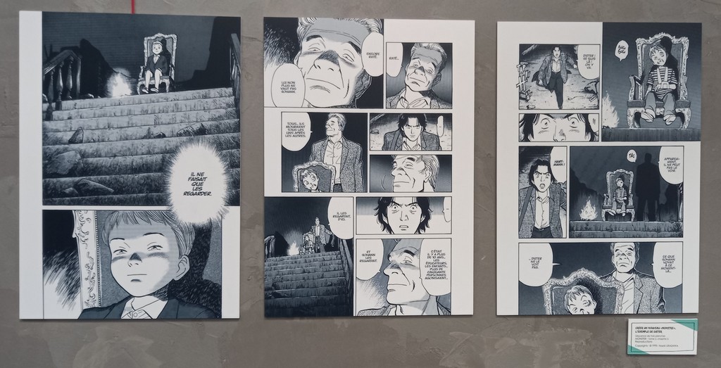 Pour les deux expos, pas de planches originales – Shōgakukan, l’éditeur d’Urasawa interdisant la sortie de ces planches du Japon – mais des reproductions et des agrandisements d’excellente qualité et une scénographie époustouflante.