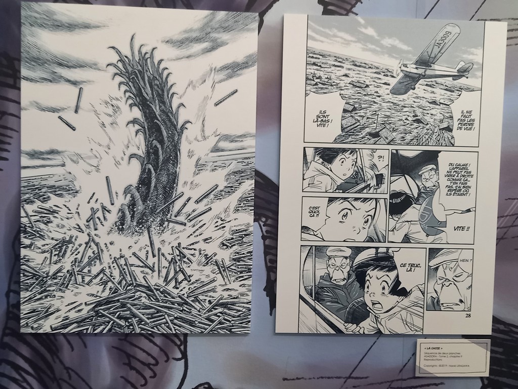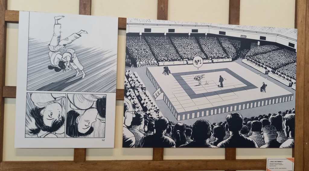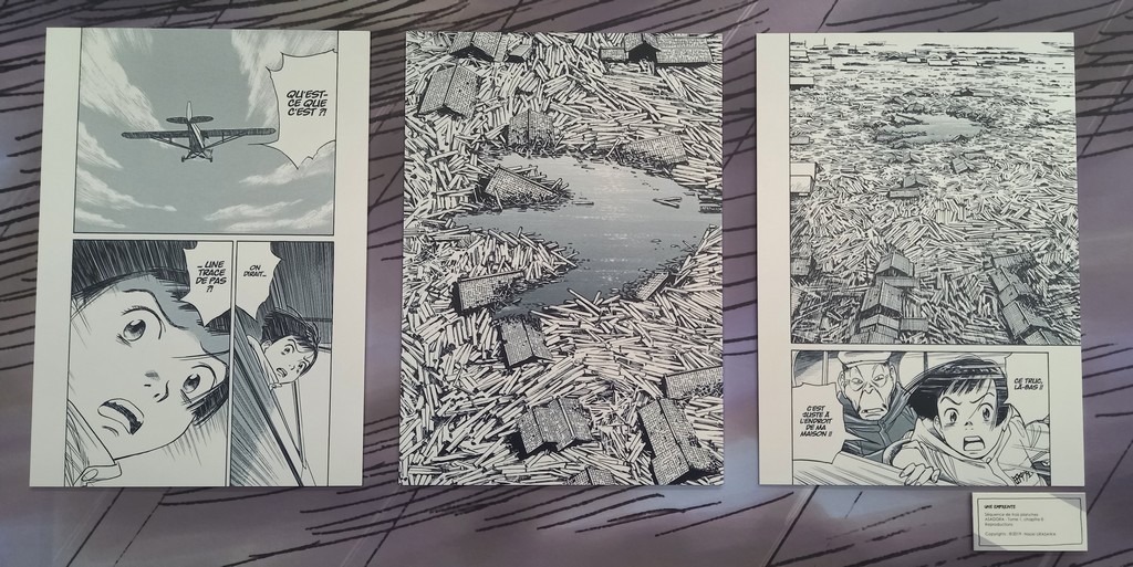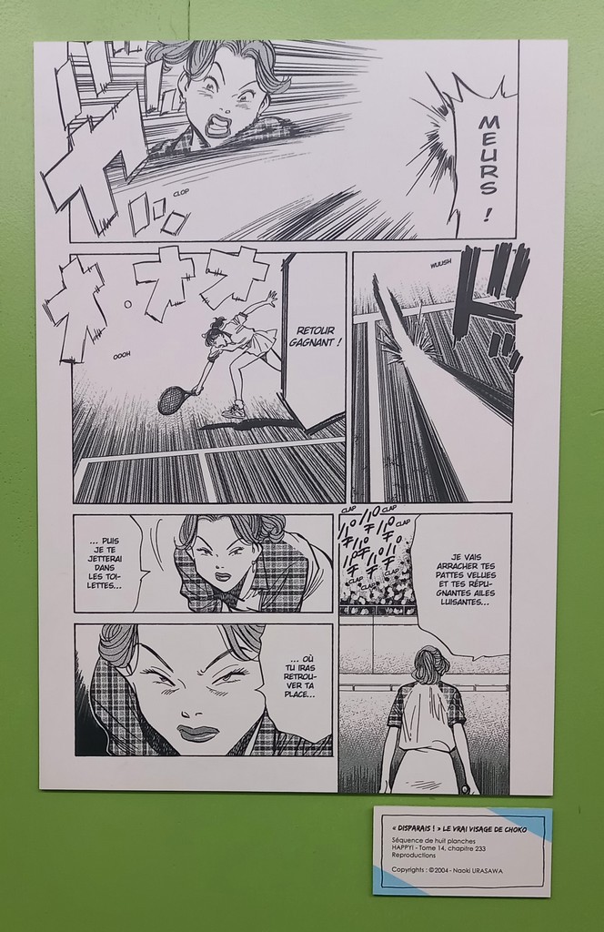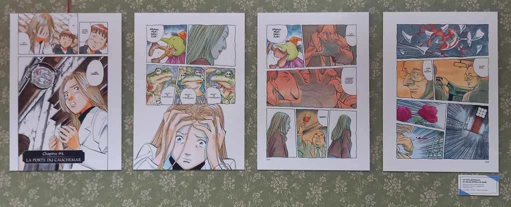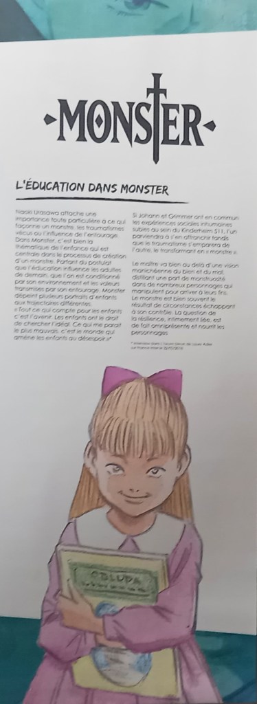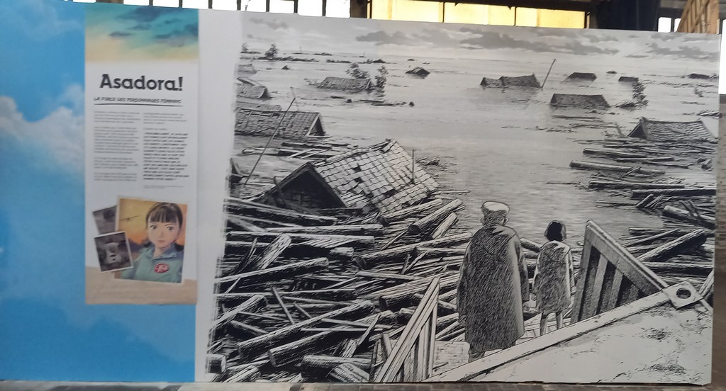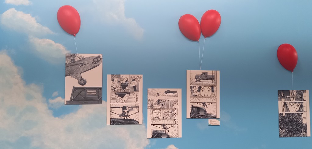 Pour les deux expos, pas de planches originales – Shōgakukan, l’éditeur d’Urasawa interdisant la sortie de ces planches du Japon – mais des reproductions et des agrandisements d’excellente qualité et une scénographie époustouflante.