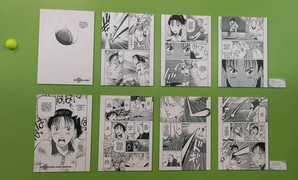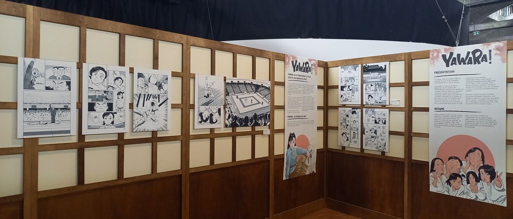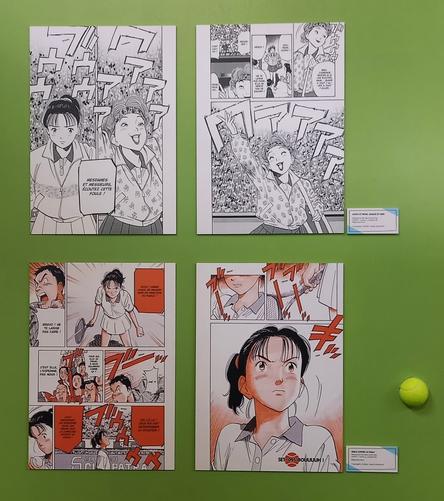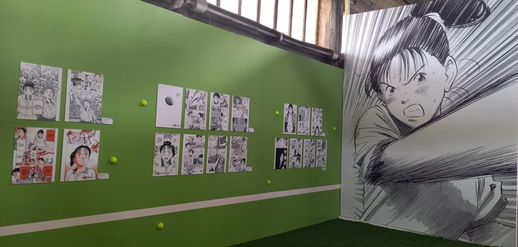 Nous sommes accueillis par deux grands visuels, belle façon de mettre en avant les héroïnes de chaque manga avant de pénétrer à droite dans le dojo de Yawara ! et à gauche sur le court de tennis de Happy !