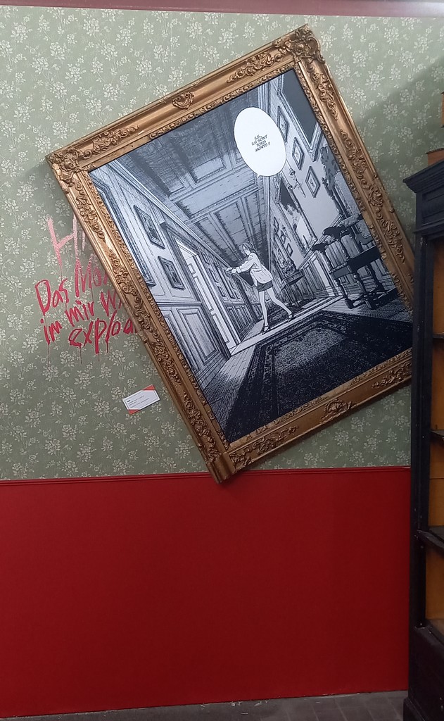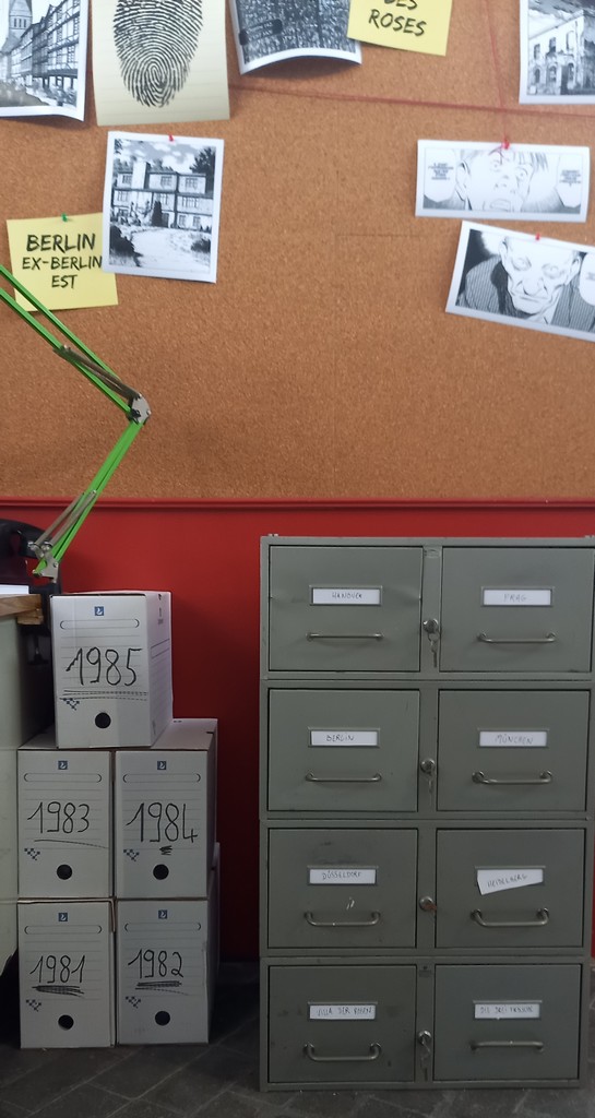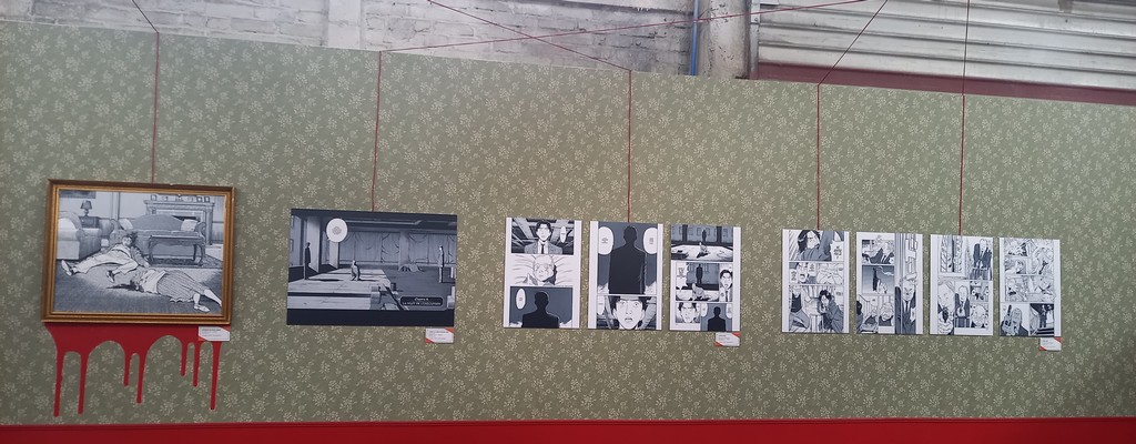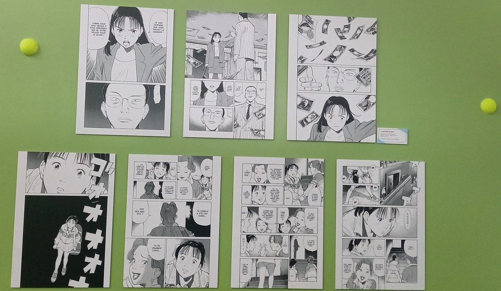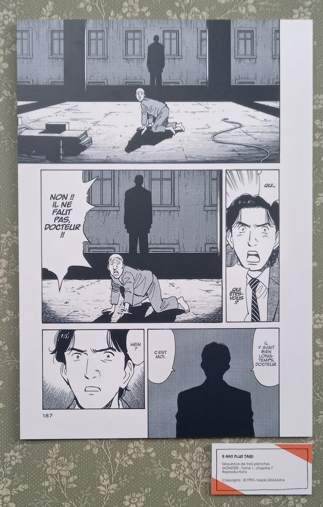 Une fois passé de l’autre côté du rideau, le visiteur entre dans l’antre de Monster et découvre au centre de l’espace un bureau surmonté d’un très grand tableau de liège, le fameux mur d’images caractéristique des enquêtes criminelles d’où comme une toile d’araignée partent des fils rouges reliant les indices aux séquences de planches correspondantes.