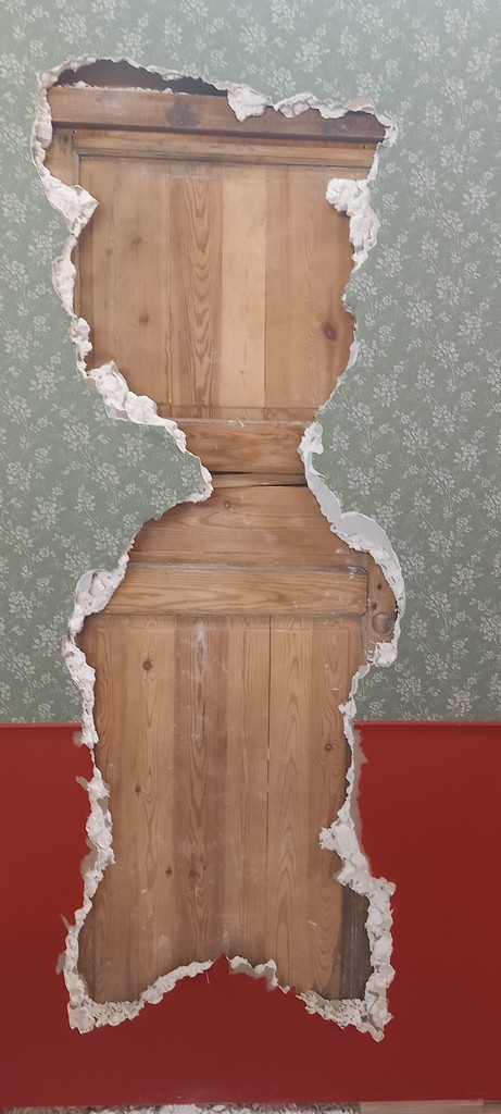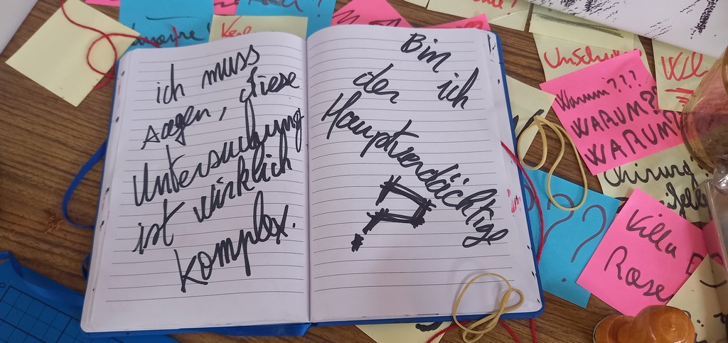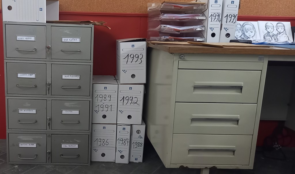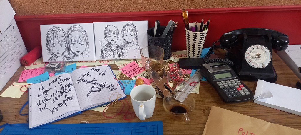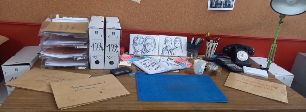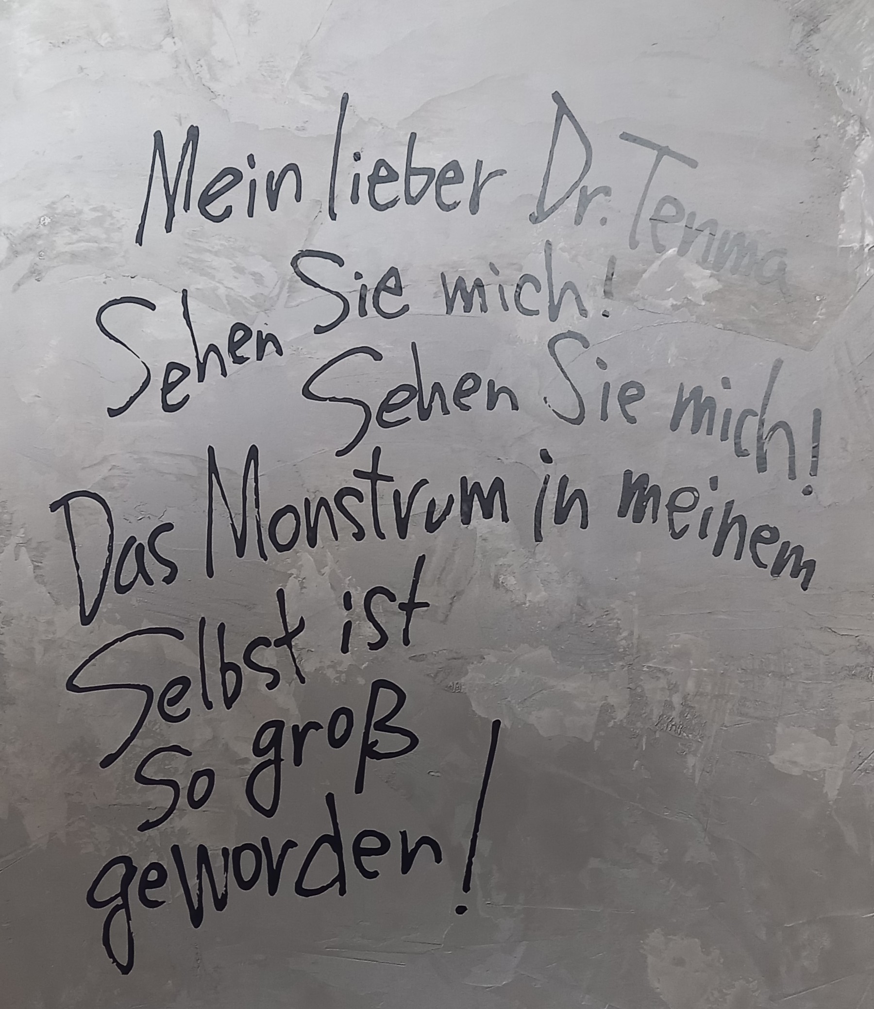 Une fois passé de l’autre côté du rideau, le visiteur entre dans l’antre de Monster et découvre au centre de l’espace un bureau surmonté d’un très grand tableau de liège, le fameux mur d’images caractéristique des enquêtes criminelles d’où comme une toile d’araignée partent des fils rouges reliant les indices aux séquences de planches correspondantes.