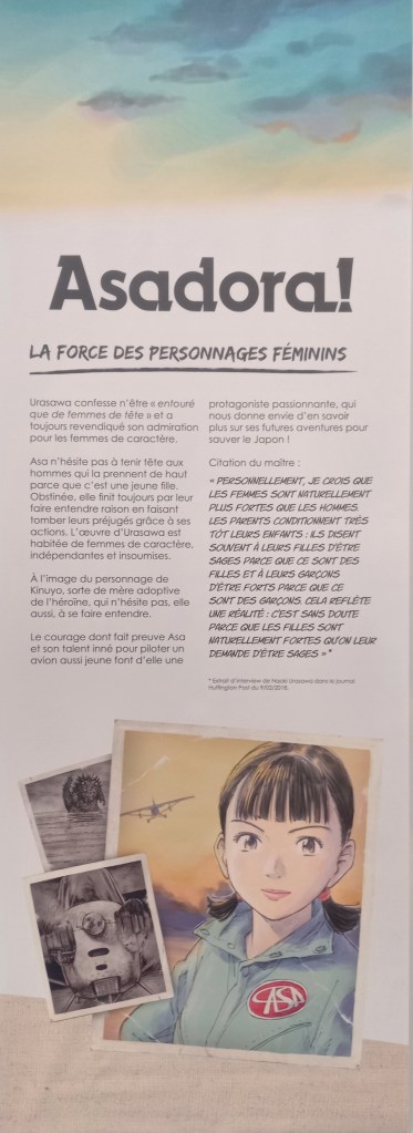 Les extraits audio traduits par Shoko Takahashi reprennent des propos tenus par Naoki Urasawa lors de la visite commentée de l’exposition du dimanche 8 juin. Ayant eu la chance d’assister à la conférence de presse du vendredi 6 juin animée par Stéphanie Nunez, directrice communication aux éditions Kana, à la masterclass du samedi 7 juin animée par Anthony Pardi et à la visite du dimanche, j’ai utilisé ces sources pour écrire cet article.