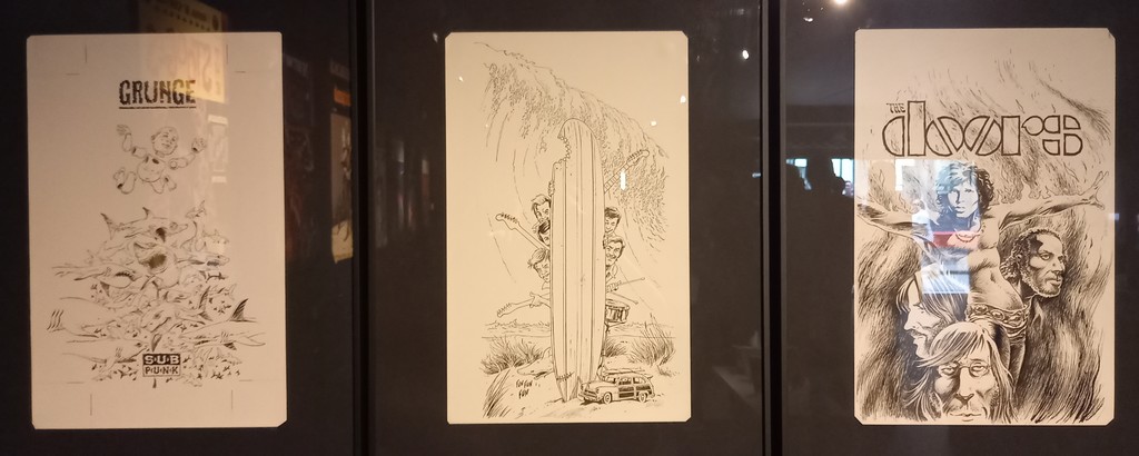 Donc j’ai fait les six studios de répétition et puis l’année suivante, quand les travaux de tout l’agrandissement ont été terminés, toute l’école est montée et ils m’ont dit Ben Riff il y a 20 portes à faire maintenant. (rires) Ce qui fait que j’ai fait 26 illustrations sur les portes et j’ai donc une espèce d’exposition permanente depuis dix ans dans cette école. Les architectes ont pris en compte mes dessins, ont choisi les couleurs intérieures des salles de classe ou de répétition en fonction de la palette de couleurs sur la porte. Ils ont joué le jeu jusqu’au bout et donc c’est très cohérent. C’est très beau. Et puis on a été obligé de développer au-delà des premiers labels d’enregistrement, c’est devenu aussi les grands lieux mythiques du rock Woodstock ou Liverpool avec La caverne et puis des grands mouvements musicaux le surf, le grunge etc, etc jusqu’au hip-hop et l’électro.