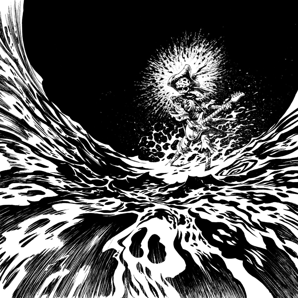 Ce n’est pas tout à fait moi qui ai choisi. C’est-à-dire que je ne savais pas du tout comment envisager la couverture d’un livre qui compile autant d’époques différentes, de styles différents et de mouvements musicaux différents mais il existait cette illustration qui avait servi de couverture à un livre pour le festival international du disque et de la bande dessinée de Perpignan. Aux vingt ans de ce festival-là, j’avais dû faire au moins neuf fois l’affiche et on avait fait de super expos. On m’a donc demandé de faire l’illustration de couverture du livre – la une de couv et la 4e de couverture – sachant que dedans on retrouvait toutes mes affiches plus les extras que j’ai pu faire tout ça mélangé avec mes copains auteurs de bande dessinée, mais aussi des musiciens et des photographes de pochettes de disques anglais, américains qui ont fait les pochettes des Stones, des Beatles, de Slade, de Bowie qui sont venus au festival. Donc ce livre compile tout cet historique-là et j’ai eu l’honneur d’avoir la couverture : cette illustration de pirate à la guitare avec ce mouvement de vagues de têtes de mort qui rappelle À Bord de l’Étoile Matutine, mon premier album d’adaptation littéraire.