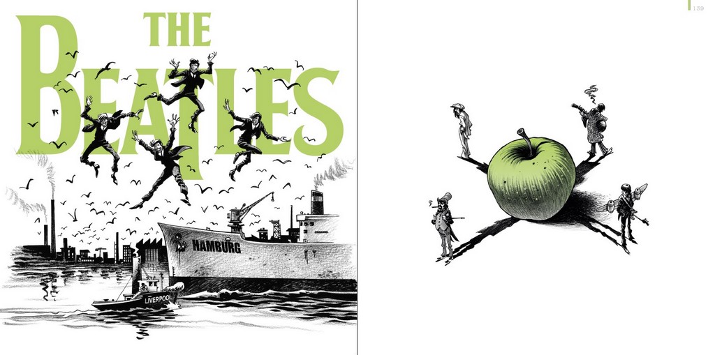 Exploser dedans. Voilà. Dans l’idée. Donc j’ai tout simplement suivi un peu les fichiers dans lesquels c’était rangé dans mon ordinateur : Les dessins de couvertures de livres, les dessins un peu éparpillés sont rassemblés tout de suite dans un premier chapitre. Après j’ai les affiches, le portfolio, l’école de musique que j’ai entièrement décorée, les pochettes de disques et puis des illustrations faites autour de groupes un peu stars, enfin un peu …