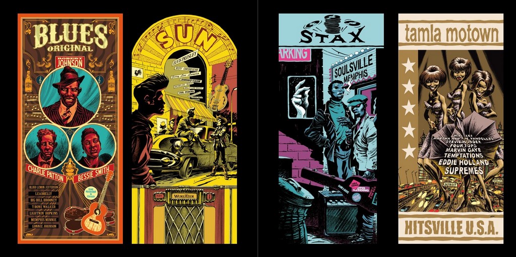 Oui, qu’on retrouve dans l’album. Au départ, ils ont dit On est musicien, on a répété un peu partout, on a enregistré des disques et donc c’est toujours le local 1, 2, 3, enfin le truc à la con comme des vestiaires ou le jaune, le bleu … On aimerait quelque chose à nous et de plus école aussi. On va donner des noms de studios d’enregistrement et de labels d’origine de la soul, du rock etc… Donc Sun Records à Nashville avec Elvis, Jerry Lee Lewis, enfin des générations de rockers blancs, « Memphis Sound » Stax avec la génération de soul noire, Otis Redding et autres et puis Tamla Motown pour Détroit et la soul.