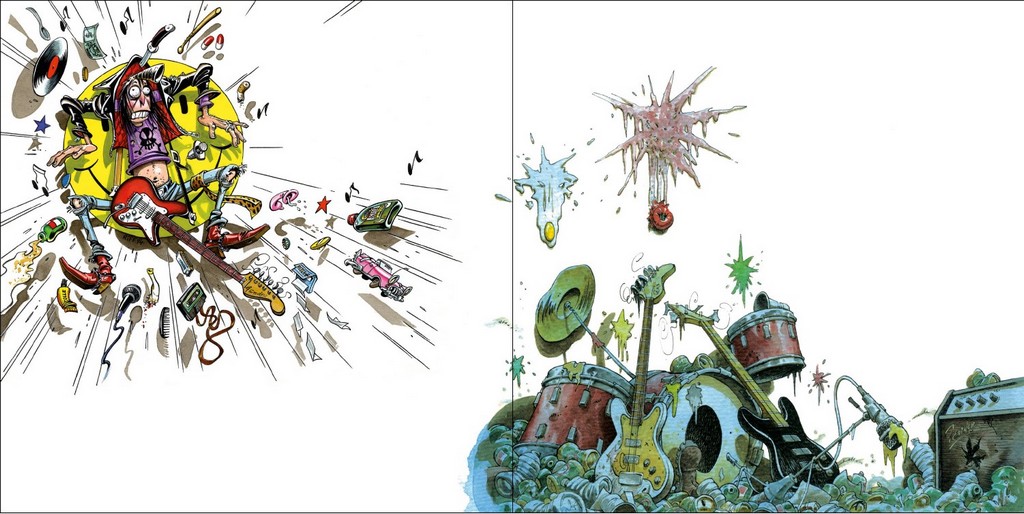 Non pas du tout. Il n’y a rien à lire en narration séquentielle. Il n’y a pas de cases qui se succèdent en tout cas. Donc pour ce livre-là, l’idée est venue simplement devant l’accumulation du matériel fait autour de cette thématique-là et inédit en bd puisque ce n’est pas de la bd. C’est du style bande dessinée puisque c’est mon style encore qu’il y plein d’évolution, plein de techniques différentes puisque ça se développe sur 35 ans de travail. En fait, j’ai un carton, deux boites dans lesquelles je mettais tous mes dessins de rock et à un moment donné, je me suis dit que personne ne connaissait ça en dehors des musiciens pour qui j’ai fait la pochette de disque, de ceux qui l’ont acheté, la salle de concert pour laquelle j’ai fait l’affiche qui a duré une semaine et qui a disparu. Le rock, c’est de l’art éphémère par rapport au livre donc la plupart des images ont une utilité courte dans le temps. Malgré tout pour moi, il y a du bon travail. Il y a parfois parmi les meilleures choses que j’ai jamais faites et ce versant de moi-même parce que la musique est importante comme vous l’avez deviné dans ma vie…
