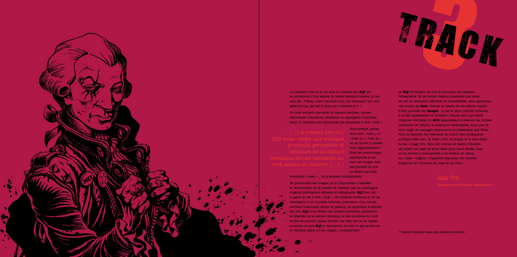 Alors effectivement, comme les choses se sont faites pas du tout avec l’esprit d’en faire un livre mais pour répondre aux exigences de la réalité Fais moi une affiche, fais nous une pochette de disque, etc… il n’y a pas de coordination dans tout ça puisque ça se développe dans le temps. Donc une fois que j’ai tout ce matériel-là sur mon ordinateur dans des dossiers, je me dis Bon, on fait comment ? Ça n’a pas de forme. Il faut lui en donner une pour le livre. Alors évidemment, sur le concept d’un livre musical, appeler track one le chapitre un, me paraît cohérent. Plutôt que d’avoir une table des matières, faire une tablature des matières, ça rentre dans l’esprit humoristique, satirique et cohérent avec l’ensemble du livre. Donc on est parti sur ce principe-là et la setlist pour le sommaire ou l’index. On a changé les noms mais les gens comprennent tout de suite à quoi on a affaire, ce n’est pas un problème. Ça reste le concept global.
