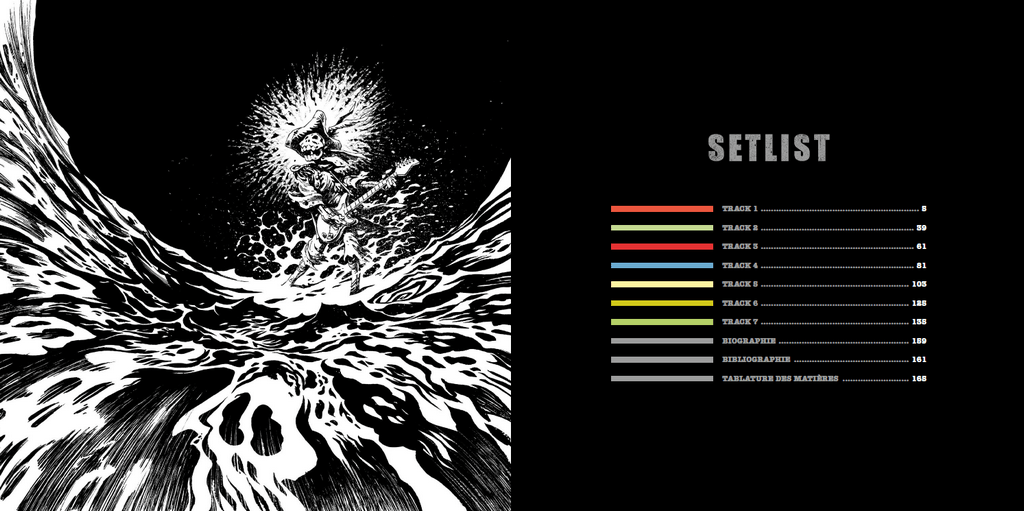 Parlons un peu de sa structure justement qui va reprendre non seulement l’aspect mais également la terminologie musicale avec sa setlist de 7 tracks, sa nomenclature des matières …. Vous n’avez pas suivi l’ordre chronologique. Alors quel est le lien entre les différentes illustrations qui constituent un chapitre, qui constituent une piste ?