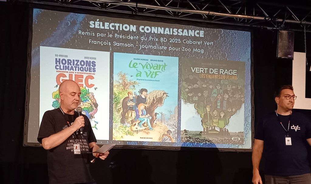 Et l’autre partie, c’est le développement durable. Alors sur deux biais, il y a un biais prix BD Cabaret Vert. Je rappelle que cette année, c’est la troisième édition du prix BD. Neuf albums sont en lice, trois albums jeunesse, trois albums tout public et puis trois albums connaissance. Les auteurs de ces neuf albums sont présents. Le lauréat de chaque catégorie se voit remettre un trophée lors d’un moment dédié. Donc on a des BD comme Verts, Le GIEC, Le vivant à vif … En jeunesse, on a Les enfants de l’arbre…