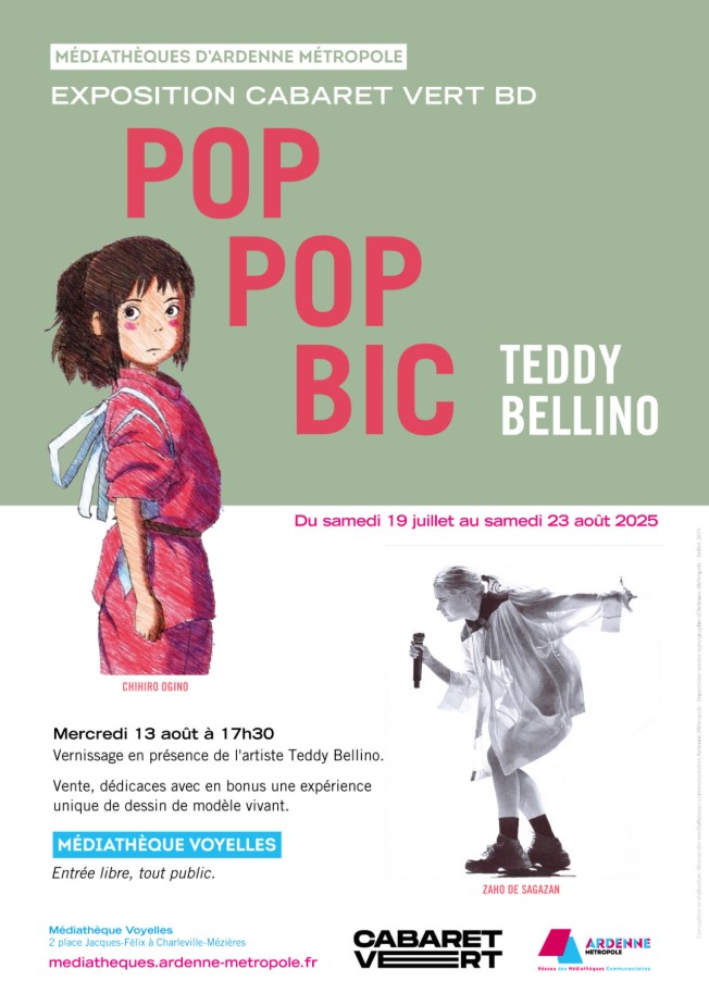 Gratuite, c’est aussi l’expo qui va se passer à la médiathèque Voyelles et là on revient à la pop culture. Dans cette expo on a mis en avant et à l’honneur un artiste Teddy Bellino qui a pour particularité de reproduire des images avec un bic, juste un bic. Alors un bic 4 couleurs parfois parce qu’il a besoin quand même de faire des dégradés de couleurs et c’est in-croy-able. Il faut vraiment le voir pour y croire ! Il y aura une vidéo avec une petite surprise : on lui a demandé de faire un Rimbaud. Donc il y aura Rimbaud dessiné de façon un peu plus pop et encore, Rimbaud dans la pop culture, ça a aussi été repris. Ensuite, on a les plus grandes séries qu’on connaît : Alien, Retour vers le futur, Pirate des Caraïbes, un de mes préférés d’ailleurs. On a aussi le personnage d’Harry Potter. On les a reproduits en taille réelle. C’est vraiment magnifique. Et Cabaret Vert oblige, il a aussi fait des artistes qui viennent cette année comme Will Smith, Zaho de Sagazan, Bigflo et Oli. C’est ouvert du 19 juillet au 23 août.