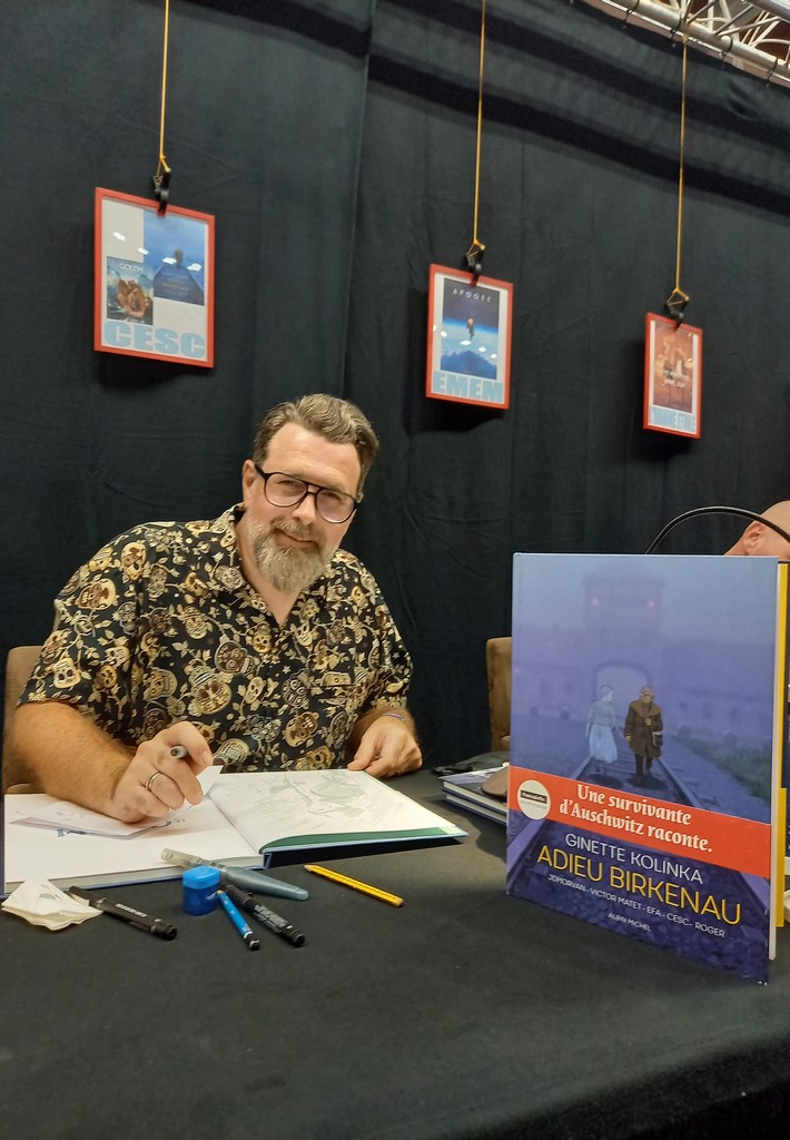 Et je termine par la proposition historique. Cette exposition fera date aussi parce qu’on met en avant une grande dame, Ginette Kolinka, une survivante qui a connu Auschwitz, qui a connu ces camps de la mort, qui fête d’ailleurs cette année ses cent ans, qui est encore en forme malgré tout et qui continue encore à témoigner. Là au mois de janvier, elle a été invitée à des commémorations. Et nous du coup, on a fait une expo parce qu’elle raconte son histoire dans la BD Adieu Birkenau.