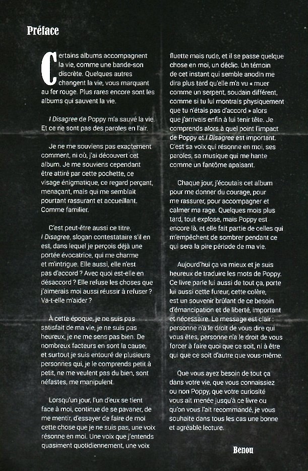 Oui. J’ai eu la chance, le privilège même de pouvoir écrire une préface pour le livre. Ce n’est pas donné à tous les traducteurs. Moi c’était un point de négociation de mon contrat. Je l’ai demandé très vite à Guillaume et il m’a dit OK, pas de problème. Et j’étais vraiment très honoré de pouvoir le faire. Et justement pour ça parce que c’est vraiment un album I disagree et tous ceux qui viennent après mais surtout I disagree – dont il est question dans Poppy’s inferno et donc dans L’enfer selon Poppy – est vraiment un album qui m’a accompagné dans des moments très très difficiles de ma vie et donc je voulais vraiment lui rendre hommage et noter j’allais dire noir sur blanc mais les pages sont noires donc blanc sur noir.