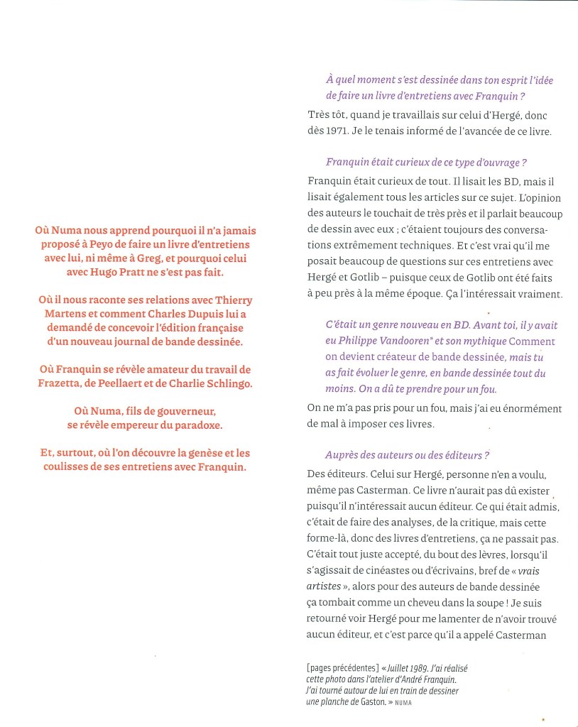 Oui parce qu’en fait ce livre Franquin et moi est né – c’est ce que je raconte dans l’intro – de la rencontre rapide avec Numa au festival d’Angoulême. On se connaissait un peu, on avait échangé à propos de Spirou etc … mais on ne s’était jamais vu et à la fin de la rencontre, j’ai dit Ah ! Ça serait drôle qu’on fasse tous les deux un livre sur Franquin ! parce que dès qu’on était rentré dans le café, on s’était à peine assis que tout de suite ça a fusé. Et ça a été ça pendant trois quarts d’heure. Et puis un jour l’idée a fait son chemin. Je me suis dit On va faire un livre d’entretiens. Lui, il a connu Franquin. Moi, pas. Chacun à sa place, parlons librement de Franquin et faisons un bouquin à partir de ces interviews dont on garde très peu finalement. On pourrait ensuite les orienter de façon à ce que ça puisse faire un livre. Numa était très sceptique sur le projet : Mais ça va intéresser qui ? On va en vendre douze … Alors moi : On s’en fout. Moi, j’ai envie de le faire. Lui : Mais ça va faire 20 pages. Moi : On n’en sait rien. Peut-être que ça en fera 40 ou 100.