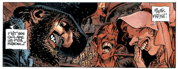Et il y avait un tiroir, deux tiroirs avec tous ses bleus de coloriage. Et là – je n’avais jamais vu ses bleus de coloriage – et là, je suis tombée sur les fesses, quoi ! Il y a une intensité chromatique, ça transforme son dessin en quelque chose d’expressionniste. Bien souvent, ses bleus de coloriage n’ont pas besoin du trait noir pour que l’émotion, l’intensité, le propos explosent. Il ne comprenait pas pourquoi on avait autant d’intérêt pour ses bleus. Mais tu ne vas pas publier ça ! Ça n’a pas d’intérêt, regarde, y’a pas le trait ! Ben oui, lui, il est dessinateur, donc qu’il n’y ait pas le trait, c’est un problème pour lui. Mais moi, ce que j’ai vu dans ces planches-là, c’était son récit sublimé, l’intensité, la profondeur de ce qu’il raconte, de son propos sublimé, explosant partout. La dernière case qu’on a mis à la fin sur une double page, c’est celle qui se passe dans la taverne dans le premier tome où il y a une scène terrible de violence où Peter est obligé de baisser son pantalon pour pouvoir rapporter la bouteille de whisky, c’est d’une violence extraordinaire dans le mauvais sens du terme, bien sûr. Et il y a cette case justement où il y a un gros plan sur tous les clients de la taverne qui rigolent avec un sourire de carnassier et on a mis cette case-là juste en couleurs : c’est rouge, c’est violent, ça explose.