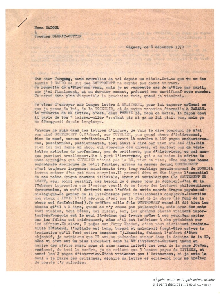 Mais oui, c’est ça, c’est frustrant. Et justement dans le Franquin et moi, on a rajouté des articles sur Franquin parus dans la presse. Il faut que ce soit lu. Ça nourrit le récit parce qu’il n’y a pas que ce qu’on dit, ce qu’on se dit entre nous, il y a aussi ce que racontent les documents. La lecture qu’il y a dans les documents, ça n’est jamais choisi par hasard : quand je mets les courriers de Jacques Glénat à Numa Sadoul en 71-72, ça raconte quelque chose, ça complète notre propos. Il n’y a pas que les photos, il n’y a pas que les dessins, il y a toute une hiérarchie iconographique qui est importante à prendre en compte.