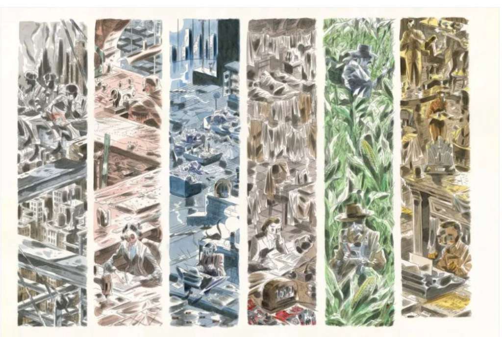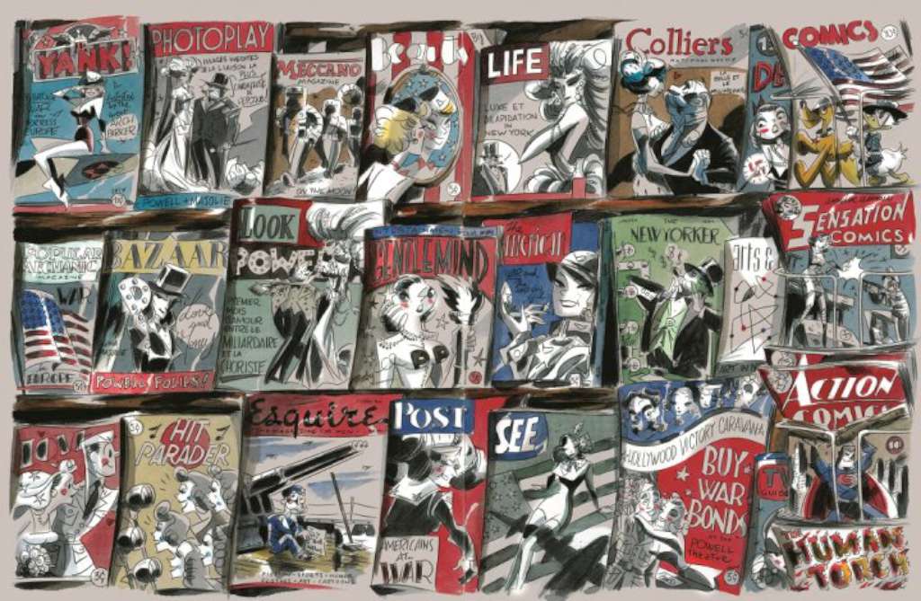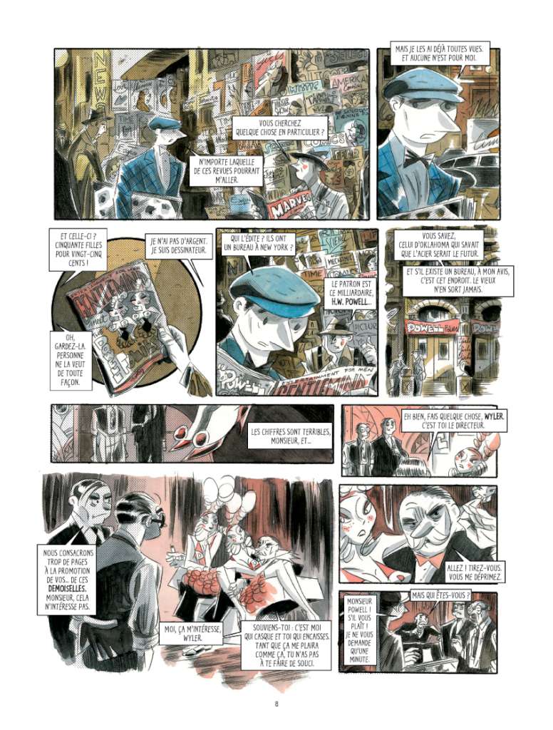 Les planches sont extrêmement variées tant dans le format des cases – illustrations pleines pages qui reproduisent de vraies-fausses couvertures de magazines ; doubles pages montrant les kiosques de journaux débordants ou la rédaction du journal – que dans leur disposition et leur palette de couleurs. Le dessinateur crée constamment des ambiances différentes ; on a une impression d’urgence, de profusion et de mouvement grâce au crayonné apparent qui retranscrit bien également le rythme de la grande ville. Certains diront que le dessin en devient parfois peu lisible, je préférerai dire qu’il est emporté par l’élan qui anime les protagonistes et que ce côté virevoltant mime l’exaltation et le dynamisme des héros.
