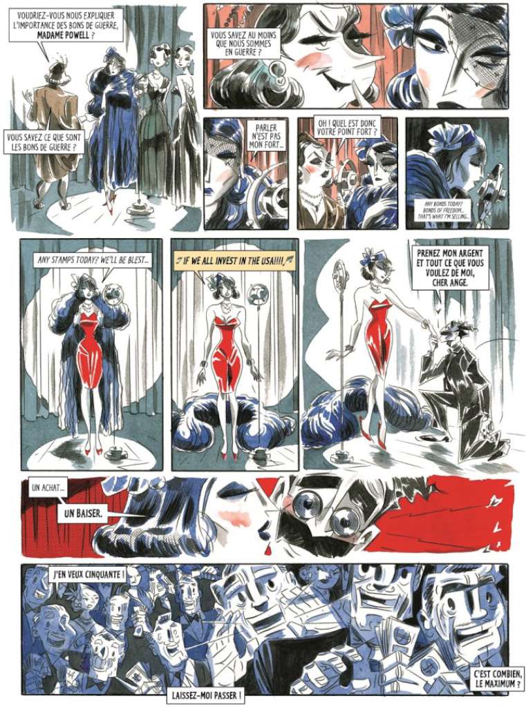 Par sa liaison scandaleuse d’abord qui fait la une des journaux people puis par sa photo sur la couverture des magazines ensuite. Mais les auteurs la font se servir de son corps dans une société machiste et patriarcale comme d’une arme pour mieux lutter contre cette dernière. En effet, l’épisode 1 montre son affranchissement progressif. Lorsqu’elle hérite, elle refuse de perpétuer la tradition des Powell Follies et ne veut pas du théâtre : elle ne se place donc pas du côté de l’exploitation du corps des femmes. De même, après sa « une » spectaculaire, elle bannit les pin-ups de ses couvertures.