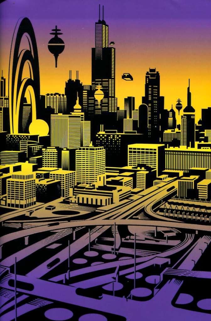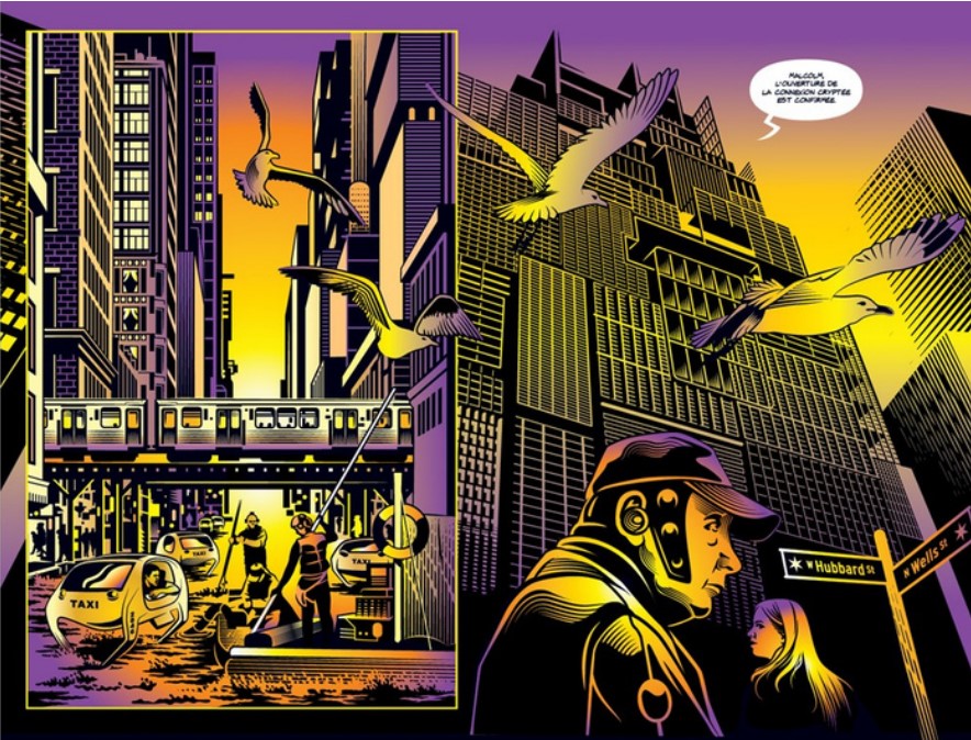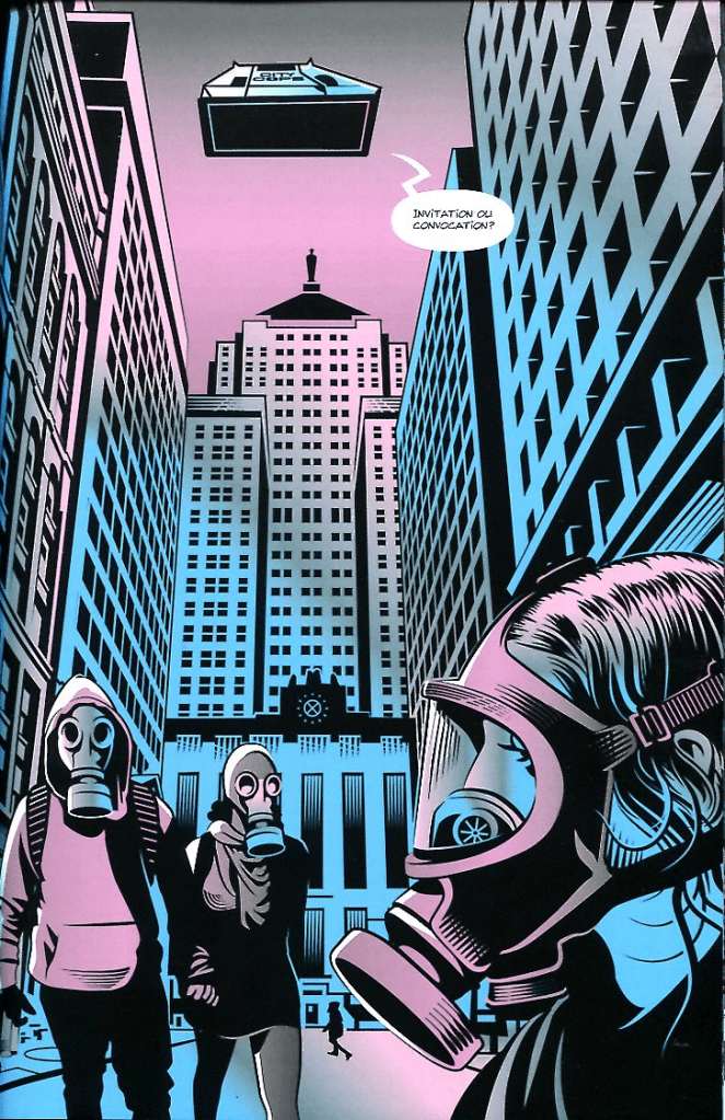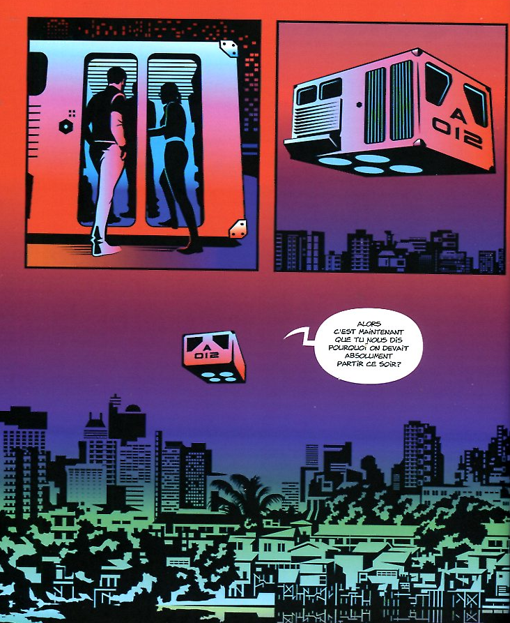S. L. : Et puis on dit aussi au lecteur, mais ça, c’est le génie d’Yann, à quel détail il convient de faire attention. Justement par exemple le truc des voitures volantes, c’est très intéressant. Au début on voit une voiture volante mais c’est une boîte ; c’est-à-dire elle n’a rien de remarquable. C’est une boite avec A 12 marqué dessus et on dirait juste une boîte qui vole et c’est une manière de dire au lecteur que ce n’est pas là qu’est l’intérêt, ce n’est pas dans le rêve futuriste classique, c’est ailleurs. Donc ça, c’est une chose qui est arrivée assez spontanément, dont on n’a même pas discuté parce qu’on était d’accord sans même se concerter.