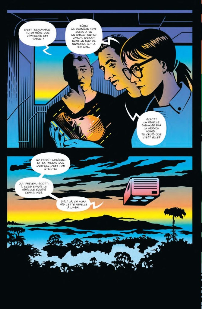 S. L. : Effectivement. Dans le pitch que Yann avait amené et dans la réflexion générale qu’on a faite puisque le livre se situe en 2060, il y a des enjeux sur la biodiversité qui sont très forts puisqu’on parle du dernier orang-outang présent et de la crise d’hystérie politique et scientifique que cette découverte génère dans l’histoire. Il y a un très grand livre d’un écrivain anglais qui s’appelle John Brunner. Le livre date de 1972 et il est traduit en français sous le titre Le troupeau aveugle. Donc c’est un livre qui a maintenant cinquante ans exactement. Et c’est un livre, on le lit aujourd’hui, on prend une claque parce que c’est un livre qui annonce exactement la crise écologique qu’on est en train de vivre. Donc je le fais apparaître dans l’histoire. On voit sa couverture, la couverture originale de l’édition américaine, on a fait attention. C’est un livre qui circule entre la Terre et l’espace et qui était pour moi à la fois une manière de saluer le génie de John Brunner que j’ai rencontré une fois qui était un réel génie qui avait une vision du futur terriblement puissante puisqu’elle se réalise et pas que sur le problème écologique. Il a aussi écrit un livre encore plus célèbre Tous à Zanzibar qui raconte ce qu’est une Terre surpeuplée et donc on voulait le mentionner pour son génie prospectif et on voulait aussi saluer à travers la citation de ce livre une des grandes collections françaises de science-fiction Ailleurs et demain aux éditions Laffont qui avait des couvertures argentées et l’éditeur en particulier, Gérard Klein. Il est toujours vivant, c’est un des grands maîtres de la science-fiction française et on ne pouvait pas faire ce livre sur le futur à moyen terme sans lui rendre hommage d’une manière ou d’une autre. Donc la citation vient de là, vient de ce désir-là.