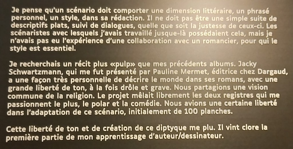 Sa collaboration avec différents scénaristes va lui permettre de varier les genres, les cadres, les époques toujours avec un souci de dévoiler les différents facettes de nature humaine. Dans chaque espace, un court texte nous éclairant sur le processus de création va mettre à l’honneur le scénariste.