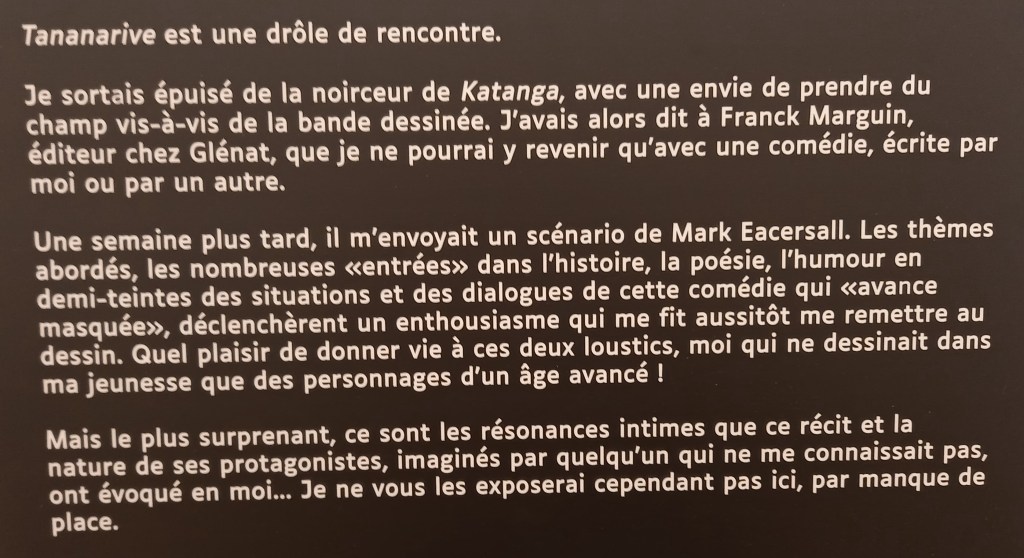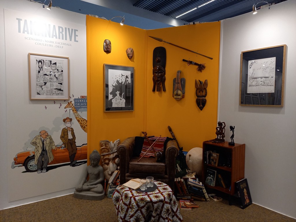 Si l’exposition est à l’initiative de Quai des Bulles et d’Antoine Rivalan (Antoane), on lui a rapidement proposé de s’associer à la scénographie, chose qu’il a accepté ayant lui même réalisé par le passé des scénographies d’expositions notamment aux festivals de Laval et de Château-Gontier.