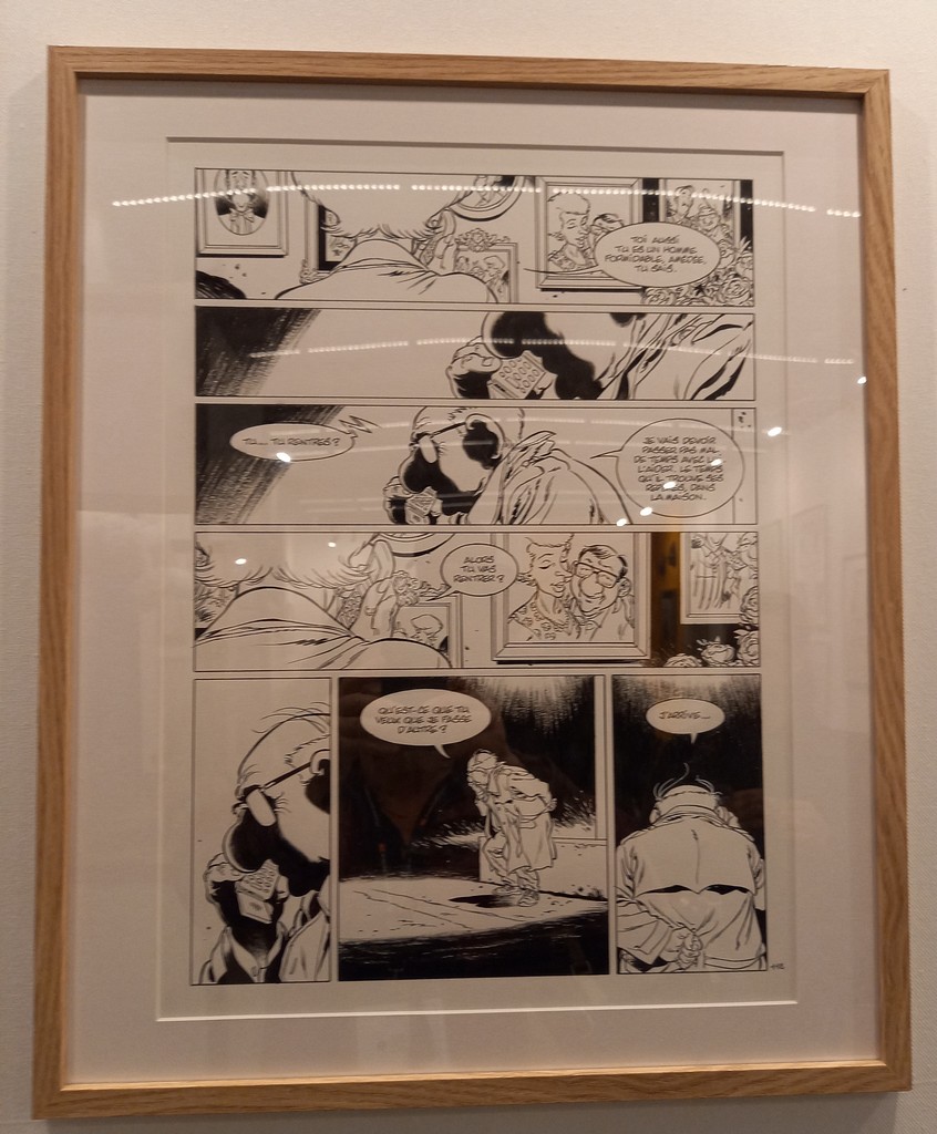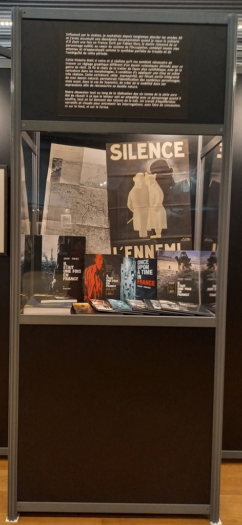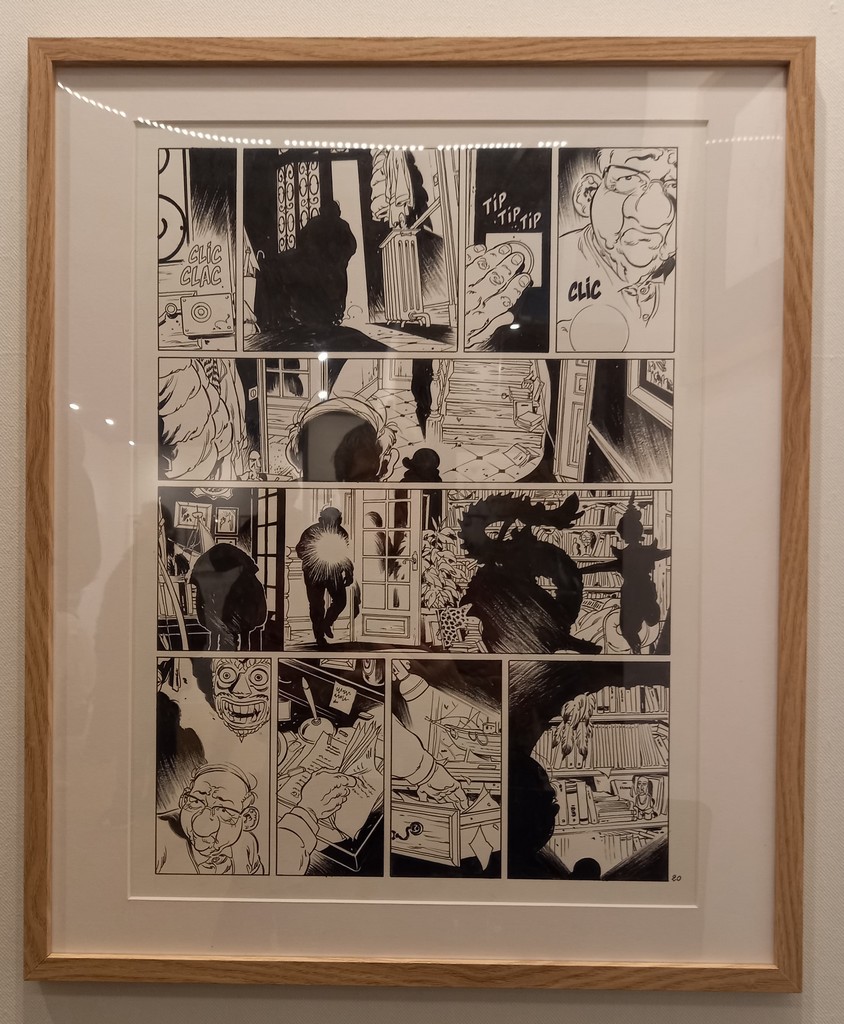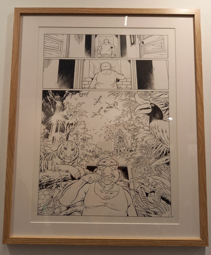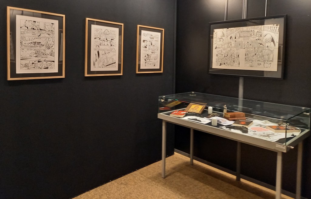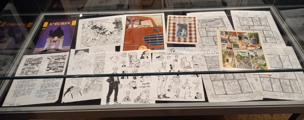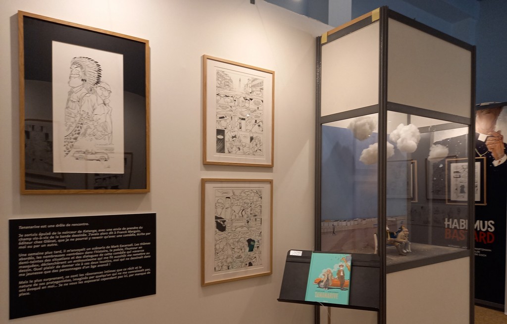 La part belle est donné aux planches originales. Pas de cartel sauf pour ses premières oeuvres ou si l’œuvre exposée a une particularité telles les illustrations inédites. C’est autour de celles-ci que va s’articuler la scénographie : documentation, vitrines contenant les éléments qui l’ont inspiré, travaux préparatoires, objets liés aux différents albums …
