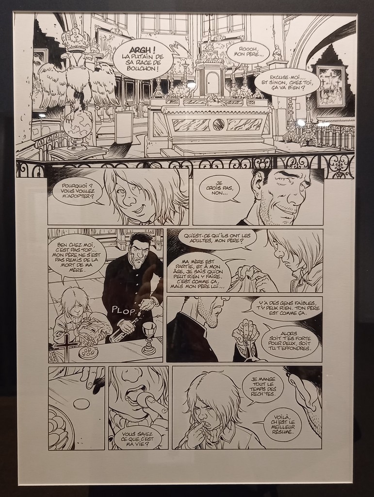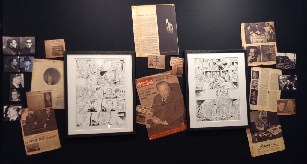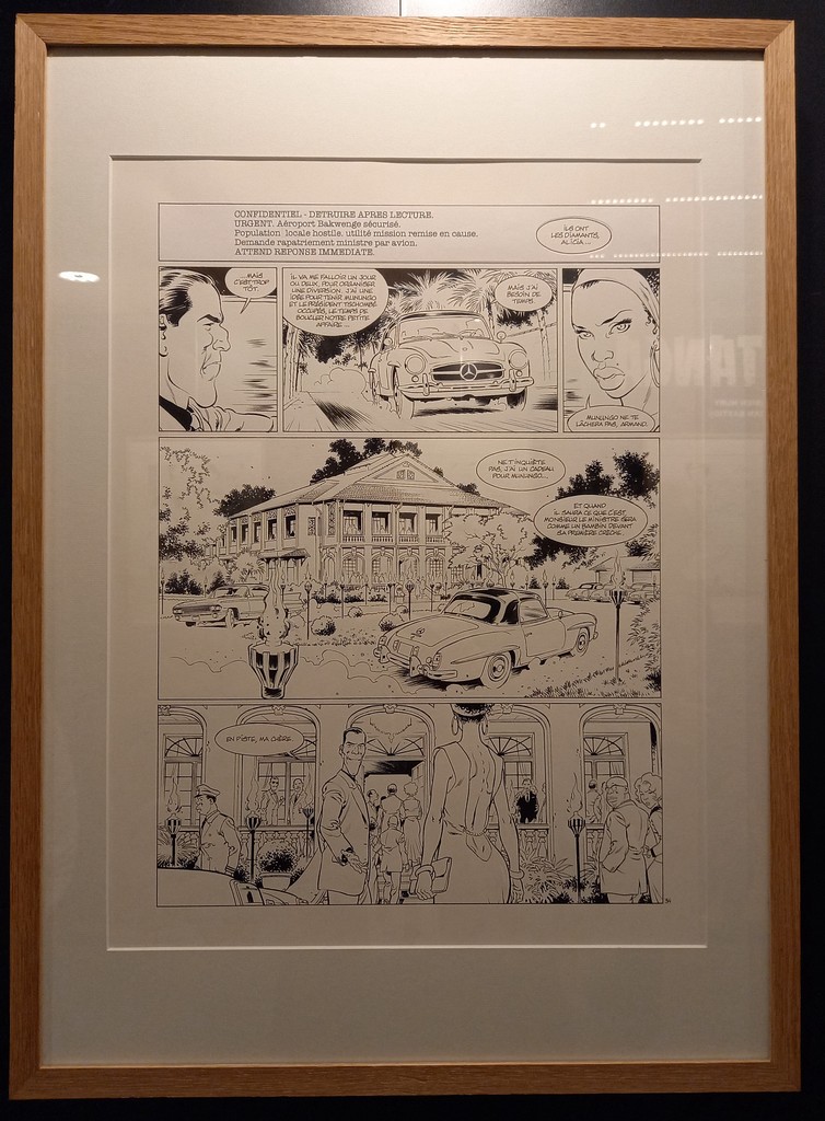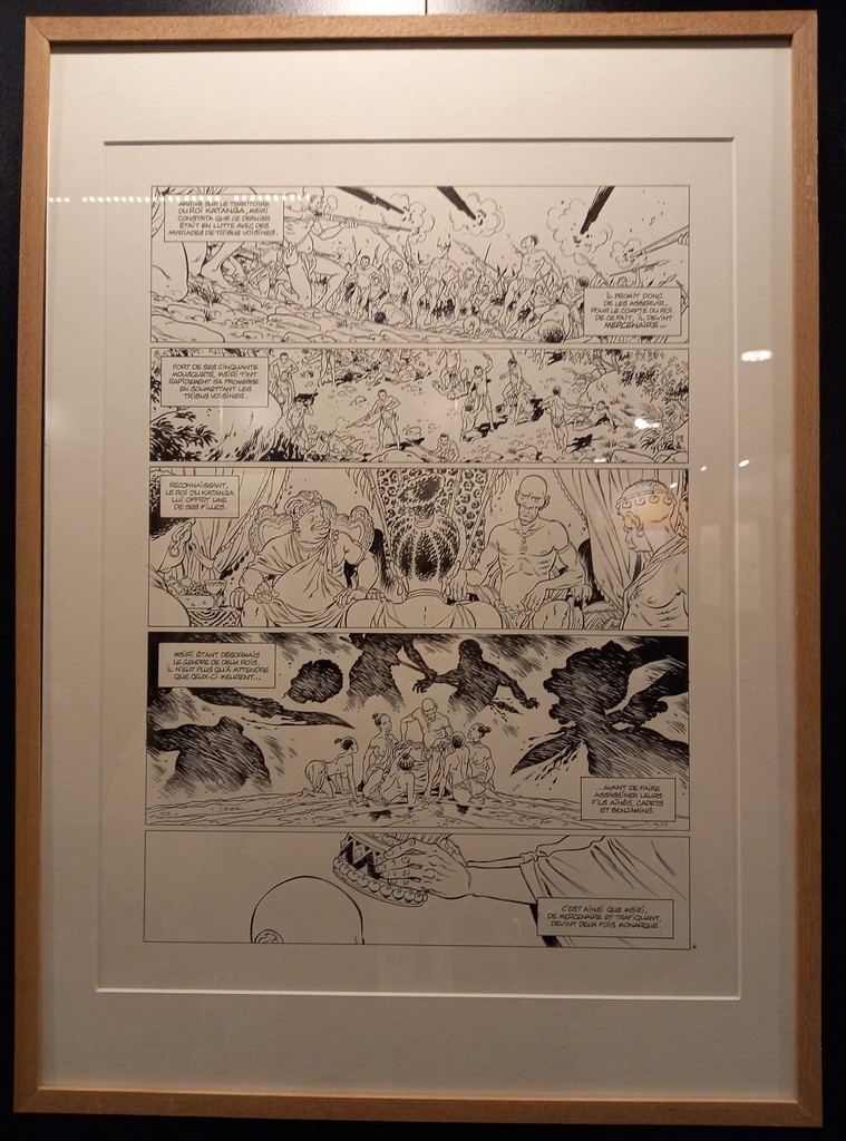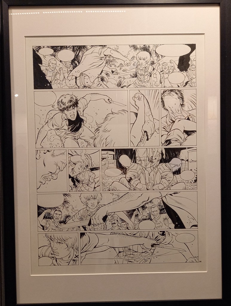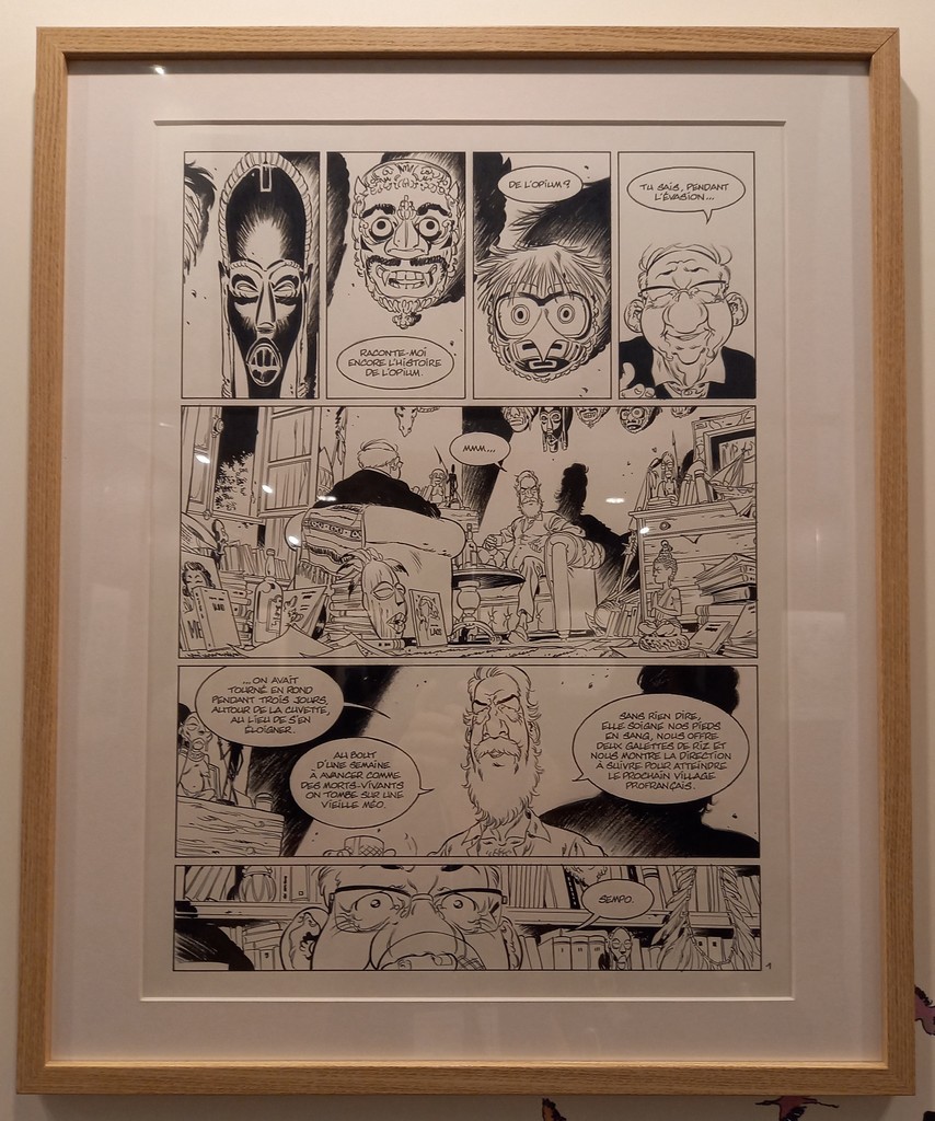 La part belle est donné aux planches originales. Pas de cartel sauf pour ses premières oeuvres ou si l’œuvre exposée a une particularité telles les illustrations inédites. C’est autour de celles-ci que va s’articuler la scénographie : documentation, vitrines contenant les éléments qui l’ont inspiré, travaux préparatoires, objets liés aux différents albums …