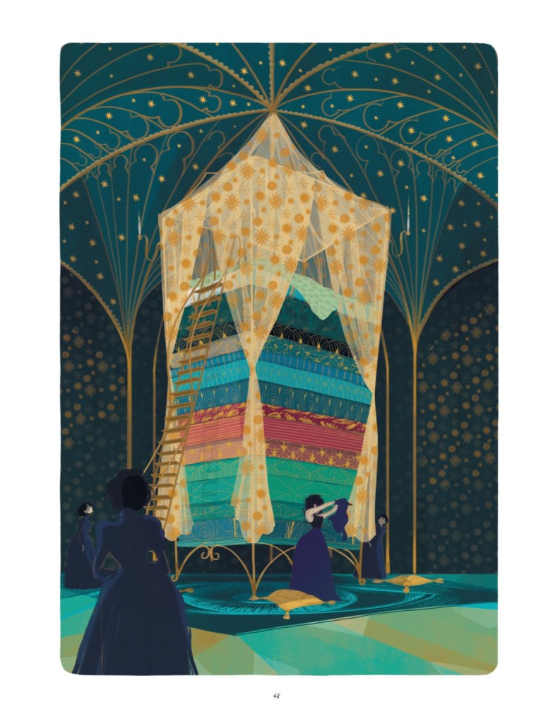 Flore Vesco déclare que ce qu’elle aime avant tout dans le conte c’est qu’il s’agit d’une culture partagée « tout public », un pont entre jeunes et adultes et qu’il nécessite surtout une lecture moins simpliste qu’il y paraît avec des « couches » (et peut être même des matelas !) de significations. Elle utilise le fantastique et même l’onirisme et pratique beaucoup la métaphore. Comment en avez-vous trouvé l’équivalent visuel ? Quelles métaphores graphiques avez-vous mises en place pour rendre ce feuilleté de significations et cet entre-deux permanent entre rêve et réalité ?