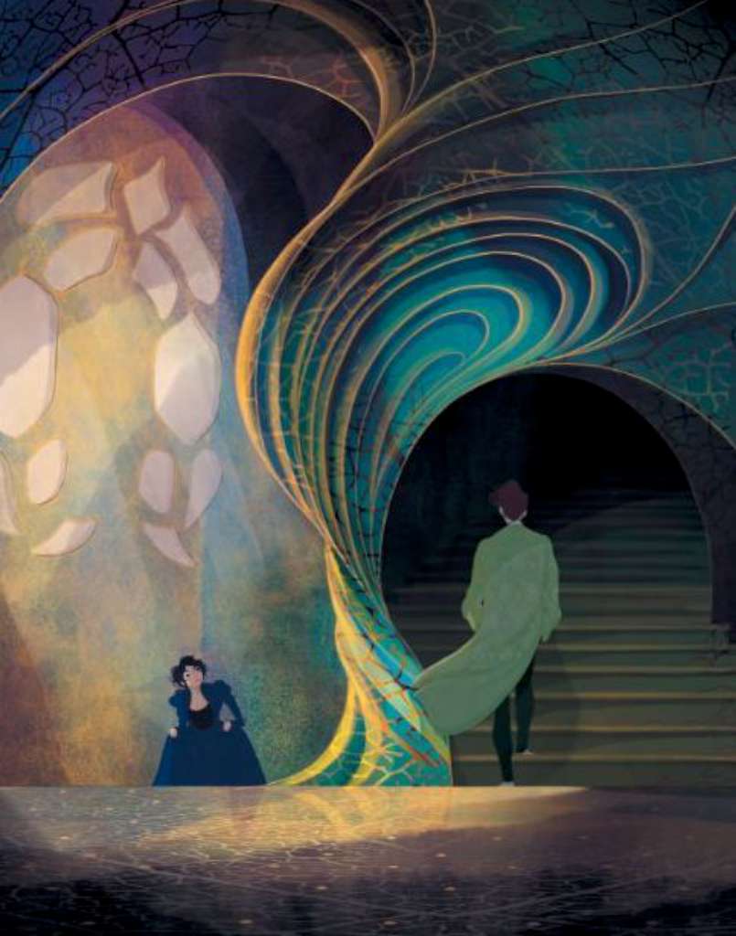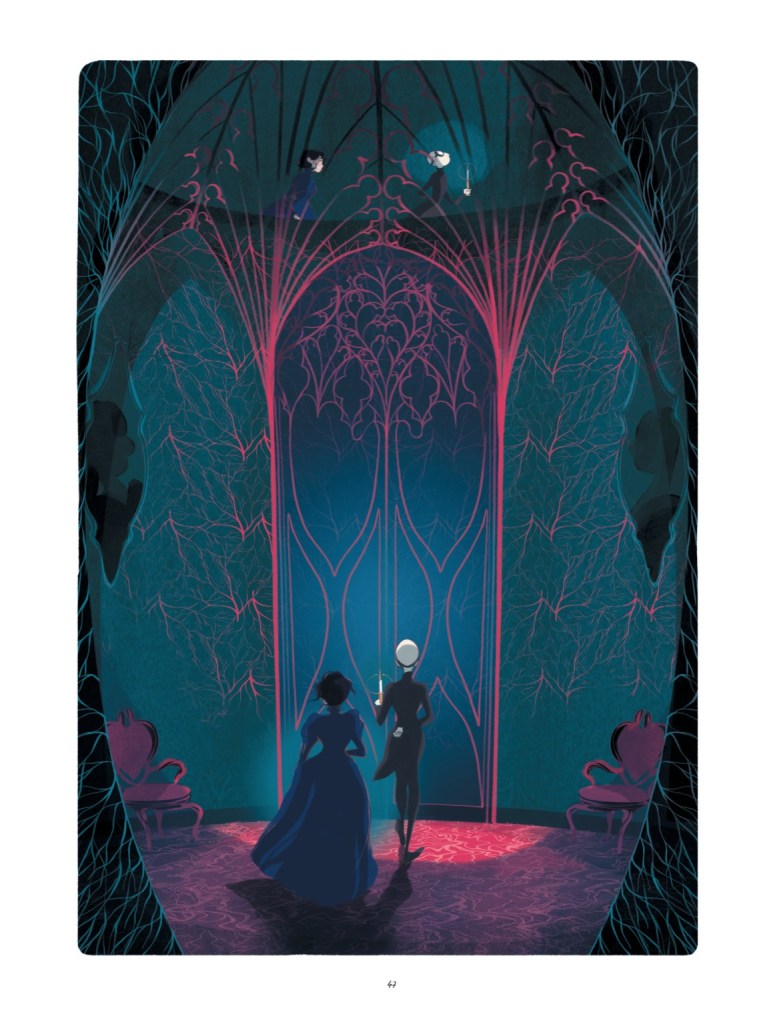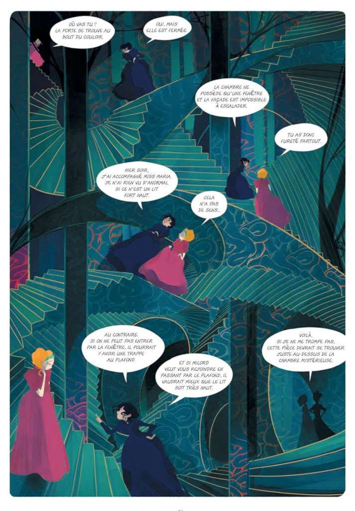 Et oui, il fallait subtilement amener le lecteur à se dire « tiens y a quand même quelque chose qui cloche dans ce château ! « Après ça ce sont des choses que l’autrice dans son roman avait décrites. Ce château il vit, il bouge et ça m’arrangeait parce les perspectives, faire des pièces, des décors, c’est pas trop mon truc, je ne suis pas très à l’aise disons ! Je trouve ça très beau mais ce n’est pas ce que je maîtrise le mieux ! Et du coup je me suis amusée à faire des choses en lignes ondulées, à donner du mouvement, à ne pas respecter les perspectives, justement, pour le rendre vivant.