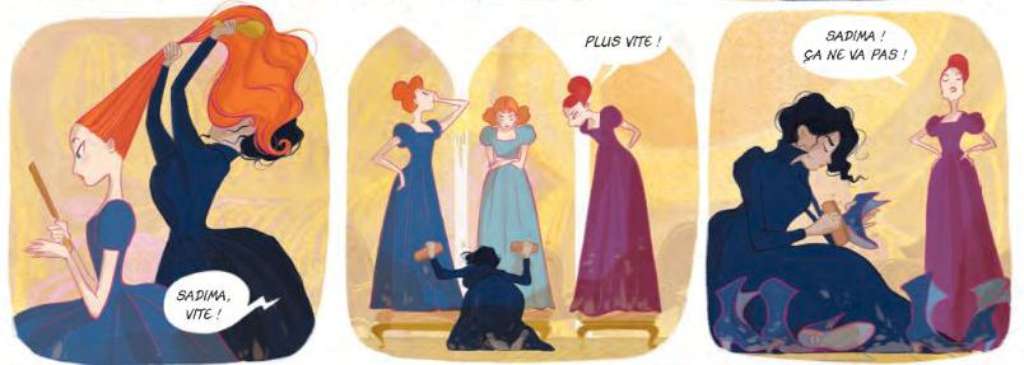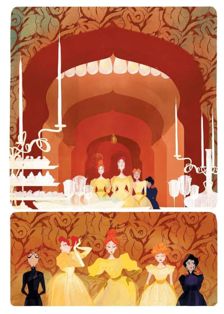 Oui c’était la première fois que je trouvais un peu me lâcher aussi sur le trait caricatural ; elles sont tellement drôles et on est complètement dans le style Jane Austen. J’avais envie de jouer avec ça, de rendre le truc comique, parce qu’elles sont complètement ridicules finalement ces personnages et c’était la première fois que je faisais ça oui parce que je n’en avais pas eu l’occasion sur les autres albums sur lesquels j’avais travaillés. On était plus sur un fond historique, on y dénonçait des choses aussi. Et là pour une fois j’étais sur un truc complètement onirique fantastique où je pouvais faire les choses autrement !