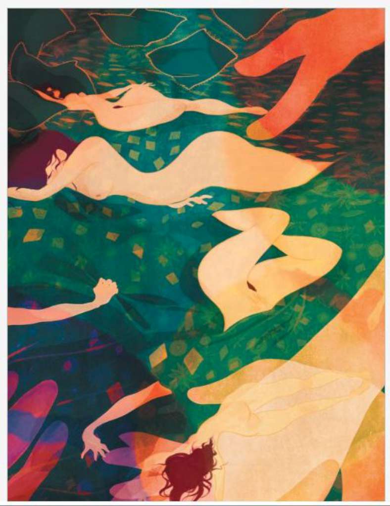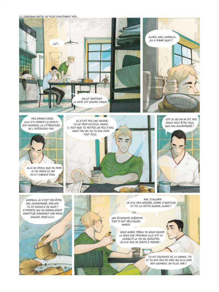 C’était le côté un petit peu délicat : être dans la suggestion sans trop choquer non plus parce que si on parle des scènes d’intimité, de sexualité, il ne fallait pas être trop frontale. Au début, j’avais proposé des choses vraiment trop crues et mon éditrice m’avait dit « non, on s’adresse à un public assez jeune, ado donc il faut y aller doucement ». J’ai donc essayé de trouver des stratagèmes de suggestions : ça peut être en forme dans les couleurs, la rondeur, les courbes et de jouer avec tout ça ; essayer de d’évoquer le toucher, la sensualité, mais comme je vous disais en jouant avec les couleurs et les formes. Il y a beaucoup de jeux sur la transparence avec les lumières et les textures qui font un peu penser à l’aquarelle.
